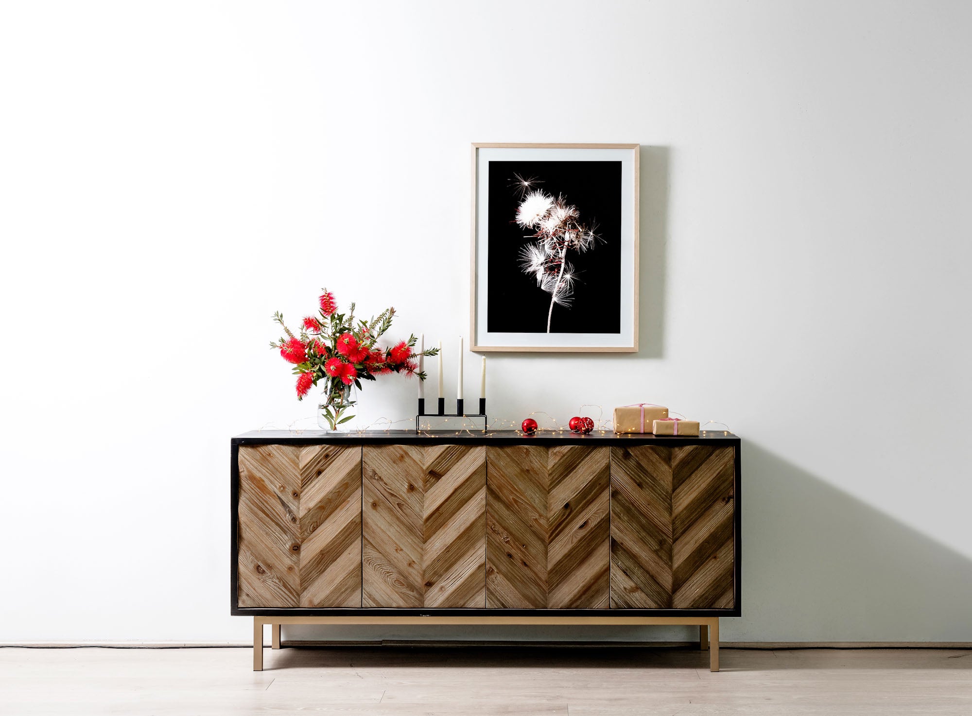 Further your home’s wooden aesthetic with a sideboard or buffet that shares a similar organic tone but has a slight textural difference. Pictured is our Rayan Reclaimed Pine Side Cabinet. A sideboard or buffet unit is not only an ideal space for festive decorating but also it provides your home with a great storage solution ( because there’s no such thing as too much storage! )