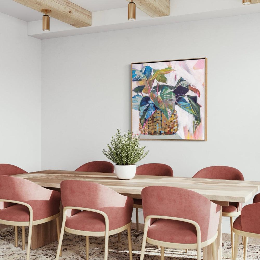 Bold leaves in rich greens and blues emerge from a textured woven basket in this lively botanical artwork. Printed and framed by Gioia Wall Art, it adds a contemporary organic touch to any interior.