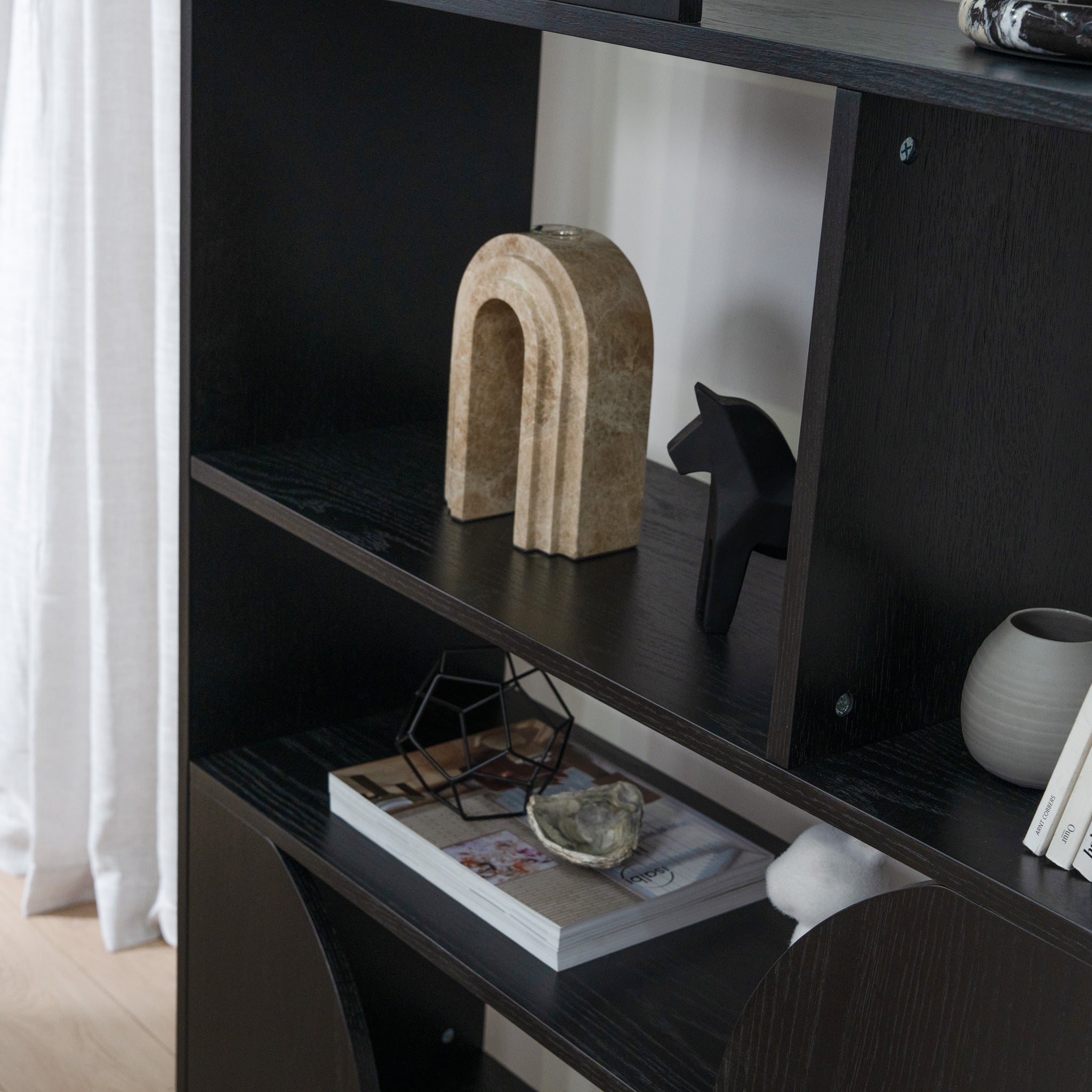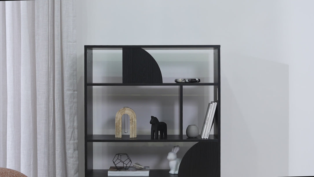 Crafted with a thoughtful geometric layout, the Adone 1.6m (H) Book Shelf in Full Black combines sharp lines and soft curves for a distinctive, rhythmic design. The interplay of half-moon and rectangular sections adds dynamic contrast, turning every shelf into a stage for your favourite objects, books, vases, or sculptures.