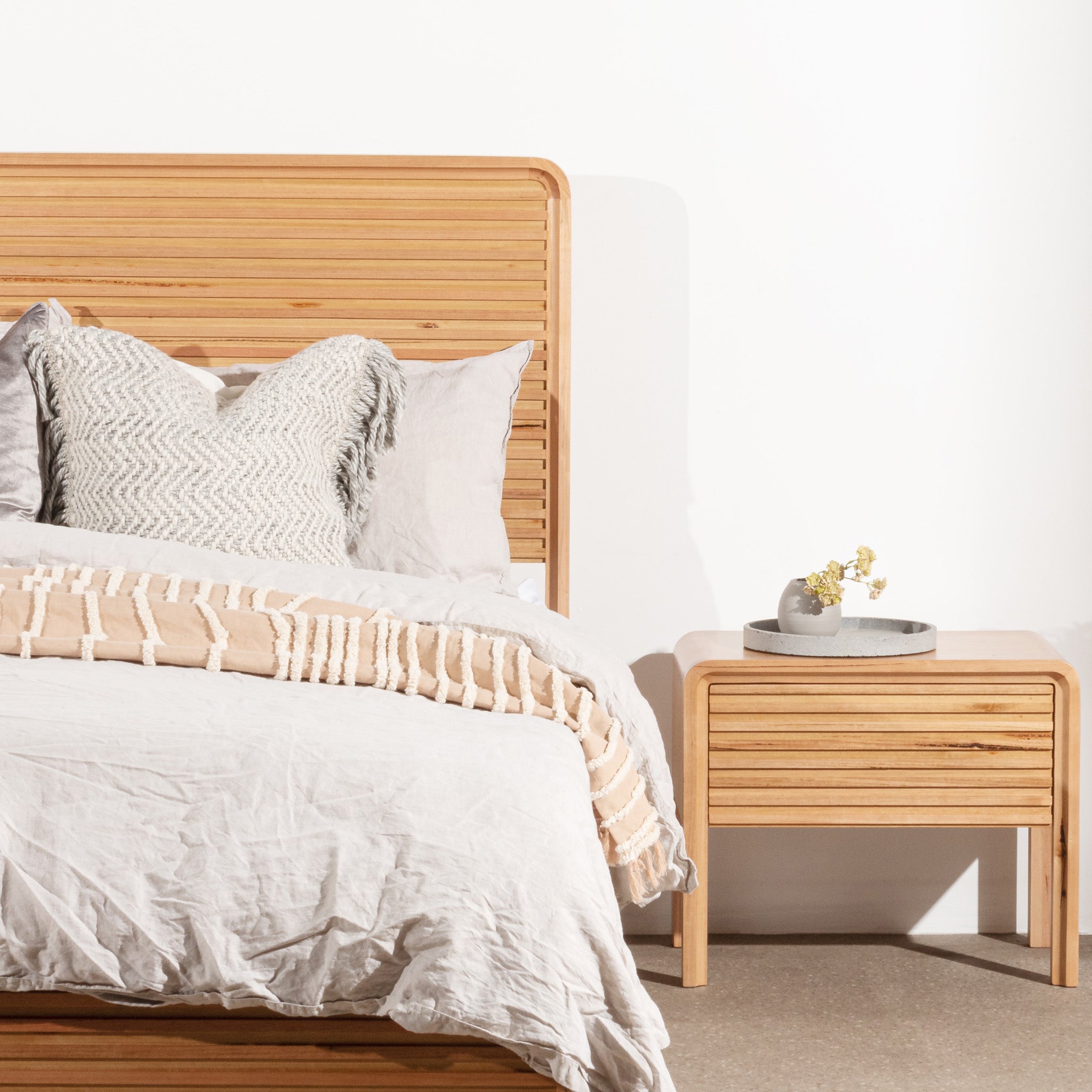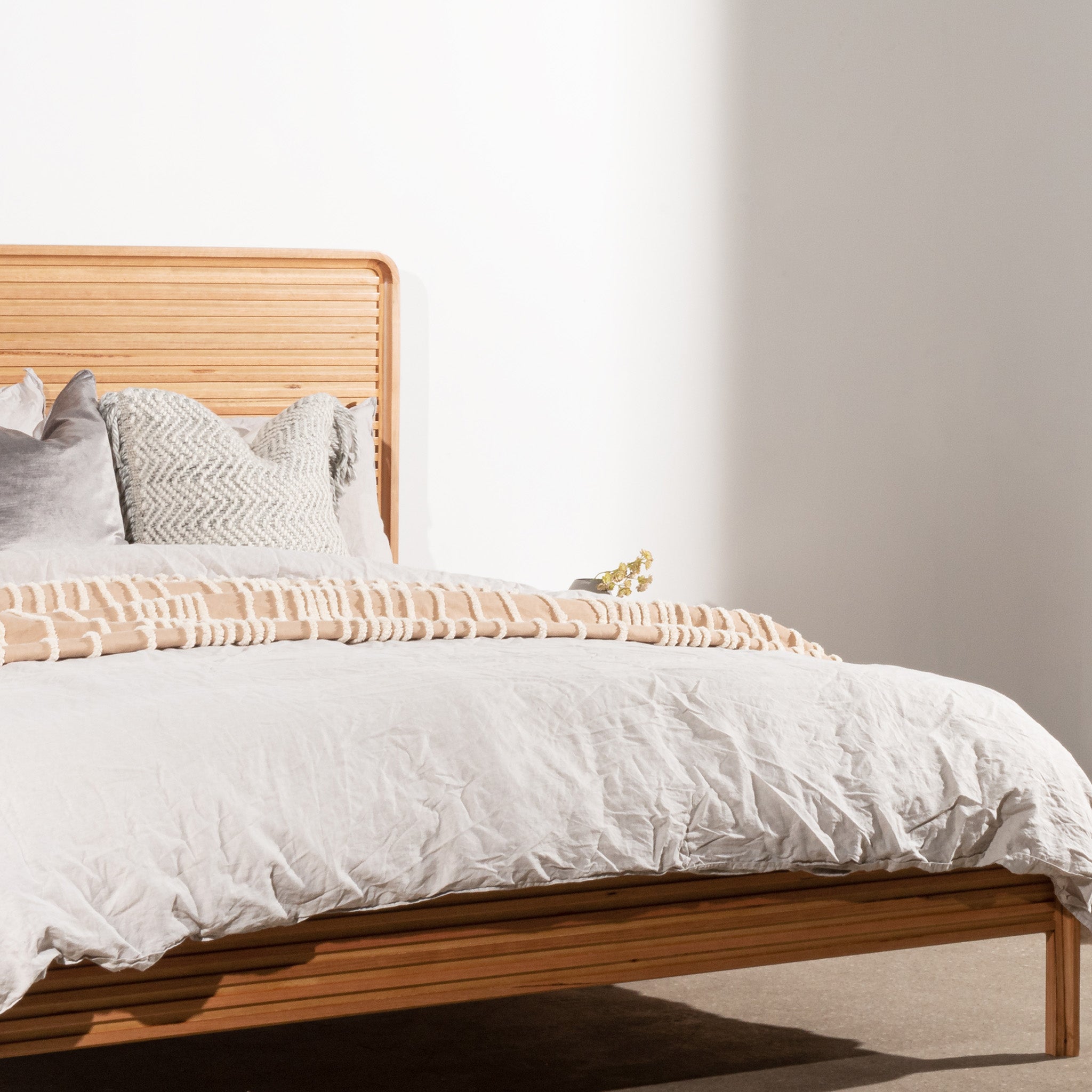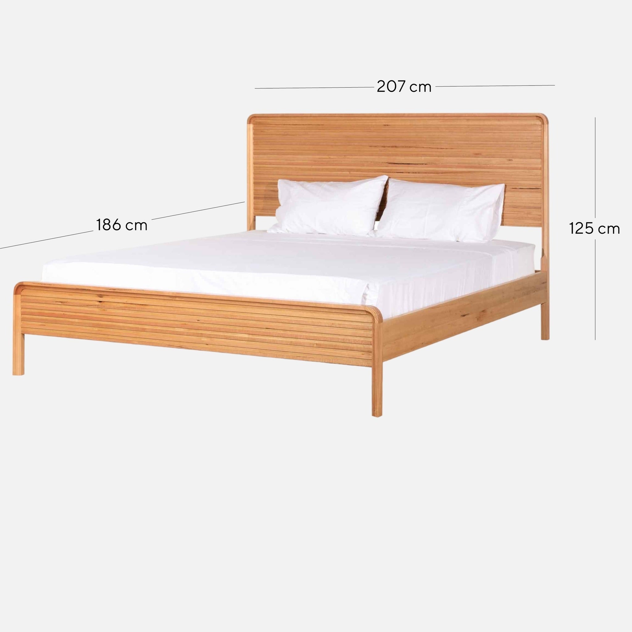 Multiply the Scandinavian or rustic style in the home with the durable wood construction and natural palette of Amparo King Bed Frame - Messmate. The light finish, wood slat design, coupled with its simplistic shape, allows Amparo to be an effortless bedroom favourite. Check our huge range of wooden bed frames.