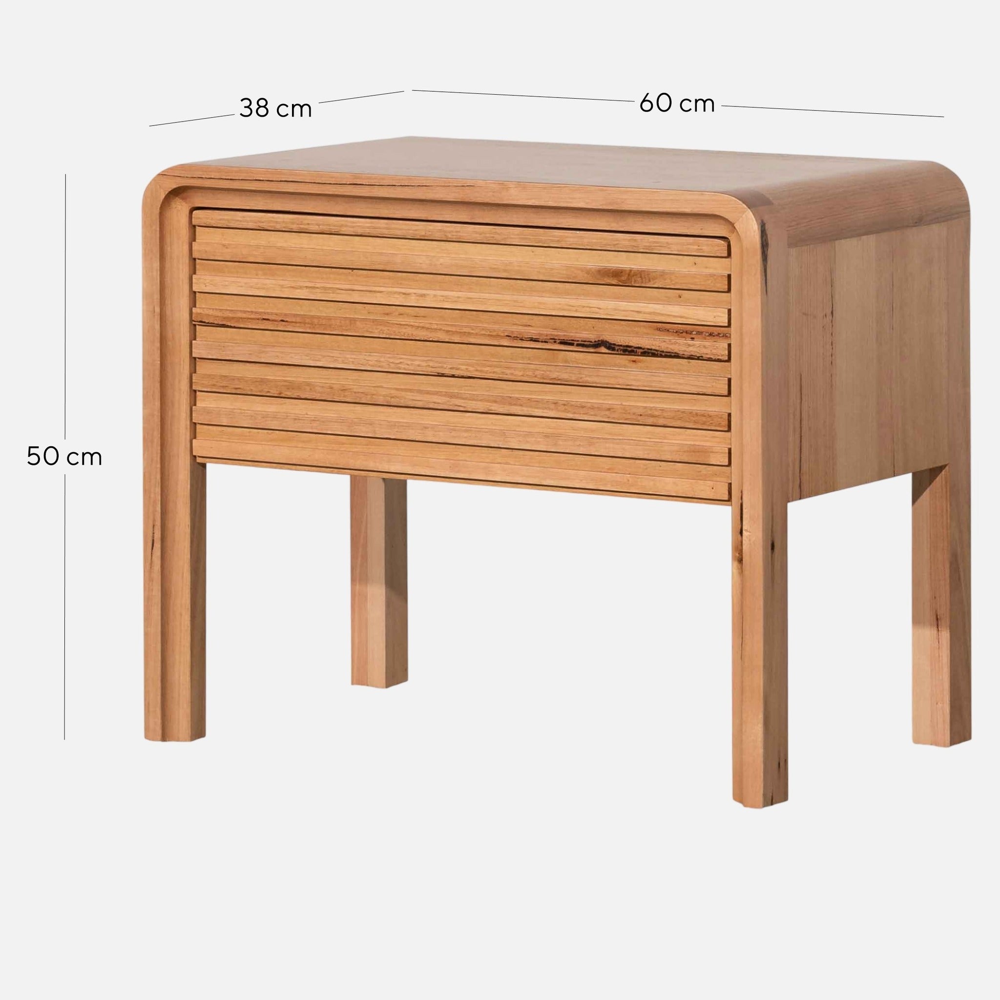 Boost the Scandinavian aesthetics in the bedroom with the on-trend design of Amparo Single Drawer Bedside Table - Messmate. Featuring 1x generous draw and wood slat features, Amparo will instil your space with looks and function. Check our huge range of wooden bedside table.