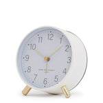 The Angelina Silent Alarm Clock - White combines nostalgia and elegance with its soothing palette and charming silhouette. Easy-to-read numbers and luxurious gold feet enhance its appeal. Perfect for cottages or chic boudoirs, it elevates any room.