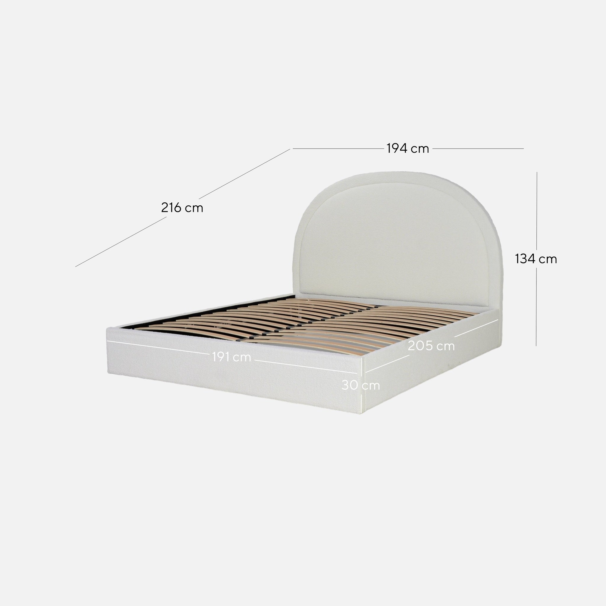 Overall: 194cm (W) x 216cm (D) x 134cm (H) Bedhead: 194cm (W) x 10cm (D) x 134cm (H) Sideboard: 205cm (W) x 3cm (D) x 30cm (H) Footboard: 191cm (W) x 5cm (D) x 30cm (H)