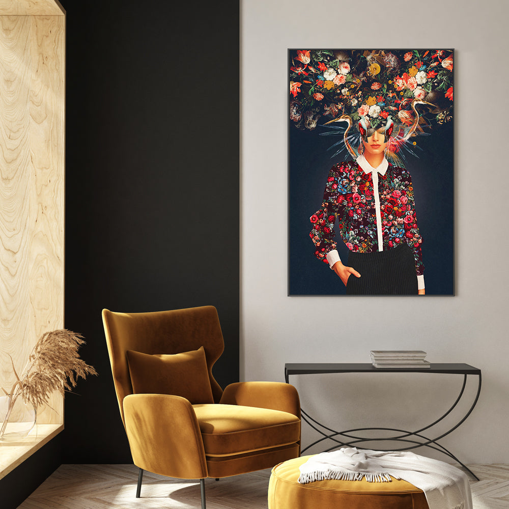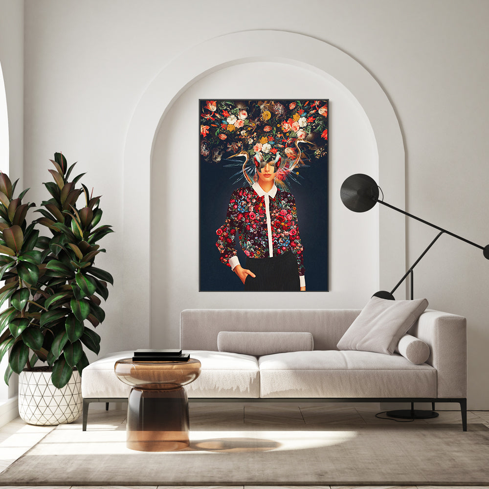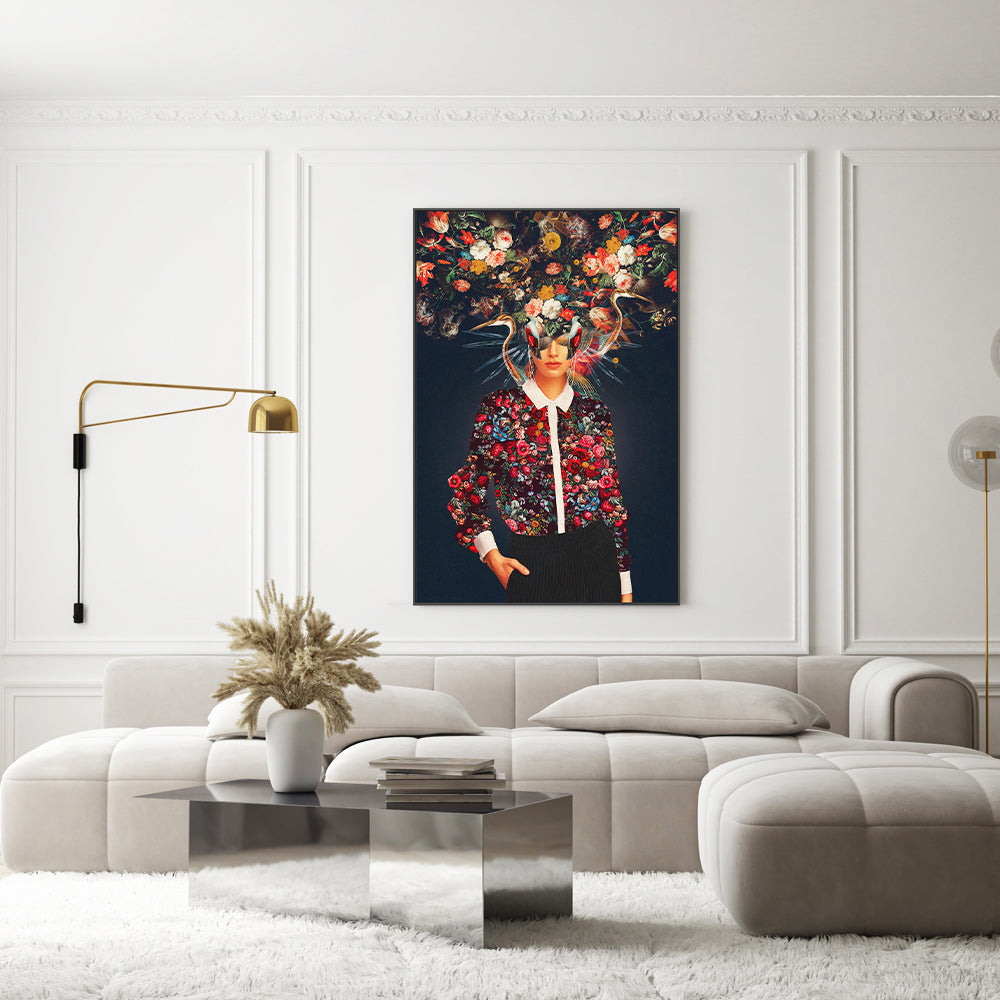 "Aria" by Frank Moth, printed and framed by Gioia Wall Art, features a striking composition of a woman adorned with intricate floral patterns and surreal elements. The bold design contrasts vividly against a dark background. Perfect for adding a unique, modern touch to any space.