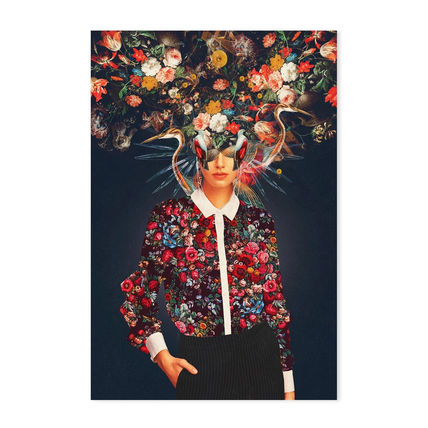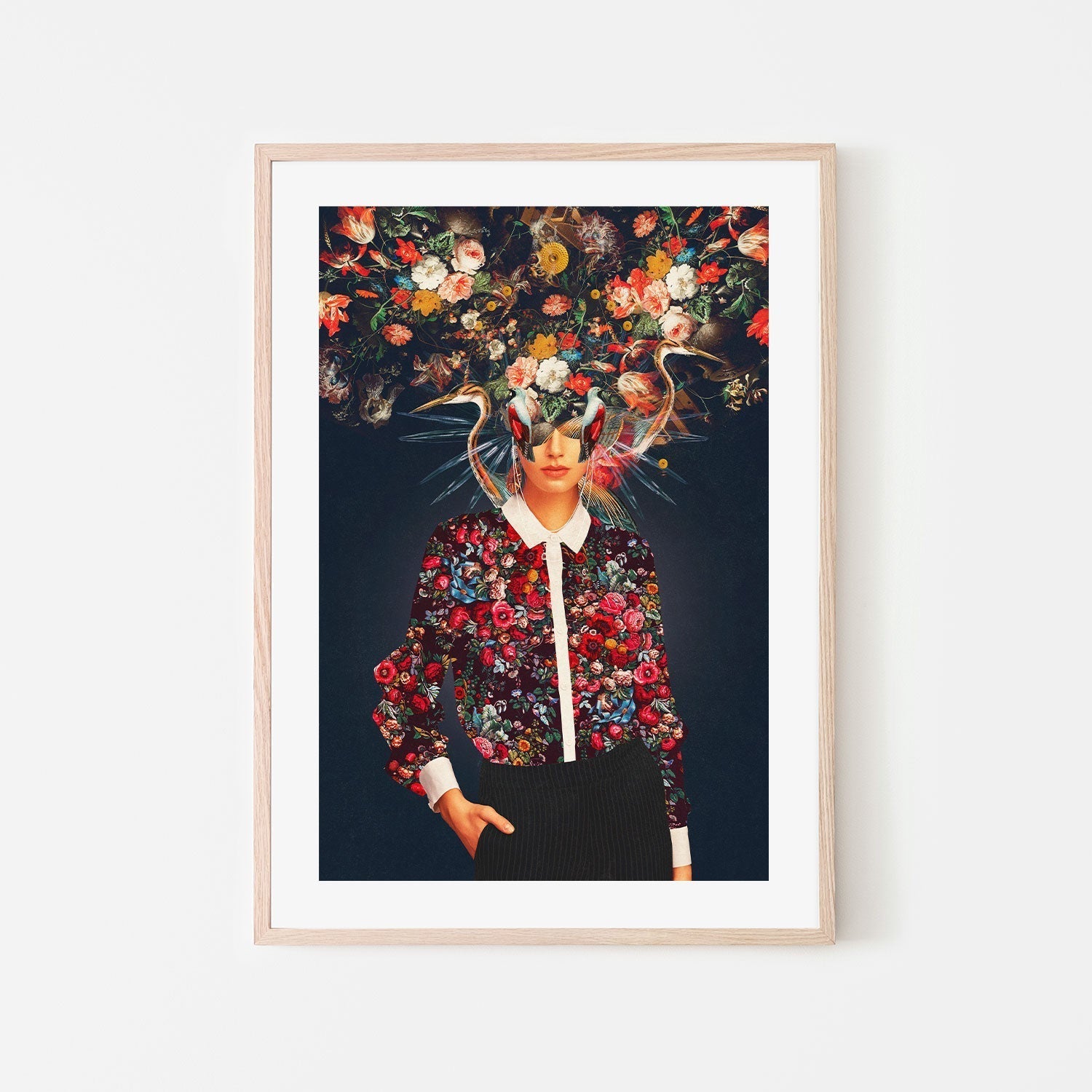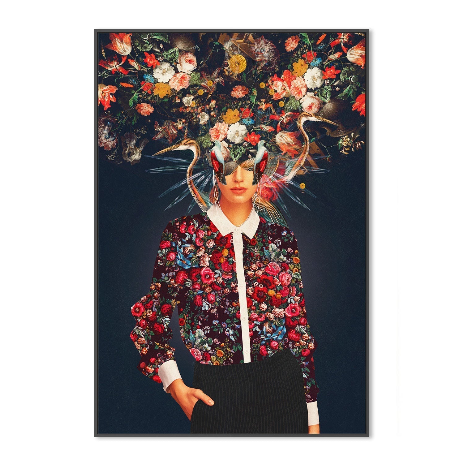 "Aria" by Frank Moth, printed and framed by Gioia Wall Art, features a striking composition of a woman adorned with intricate floral patterns and surreal elements. The bold design contrasts vividly against a dark background. Perfect for adding a unique, modern touch to any space.