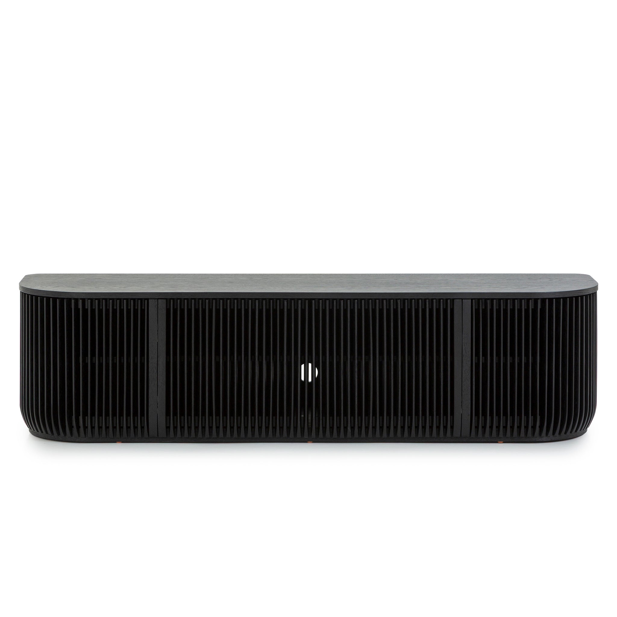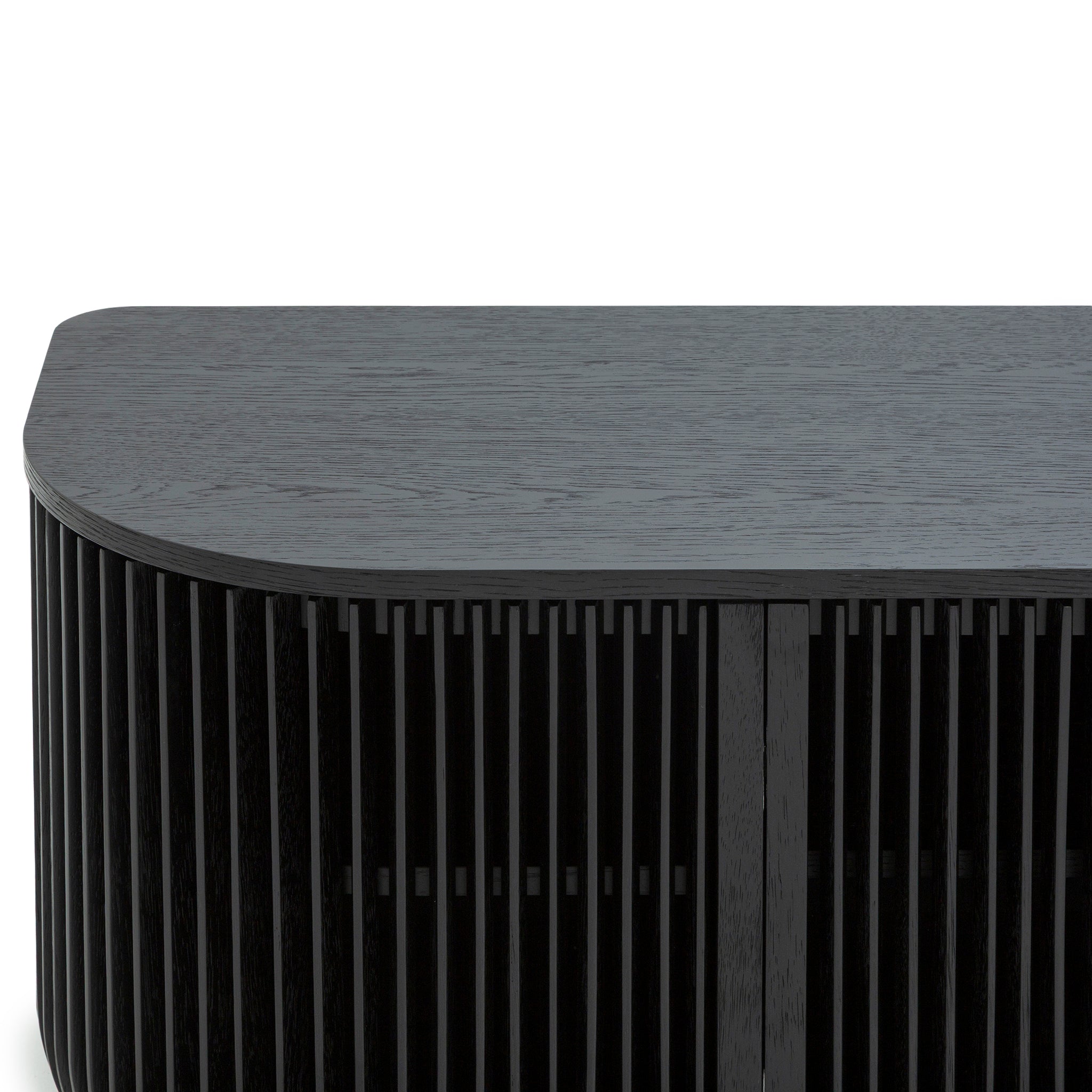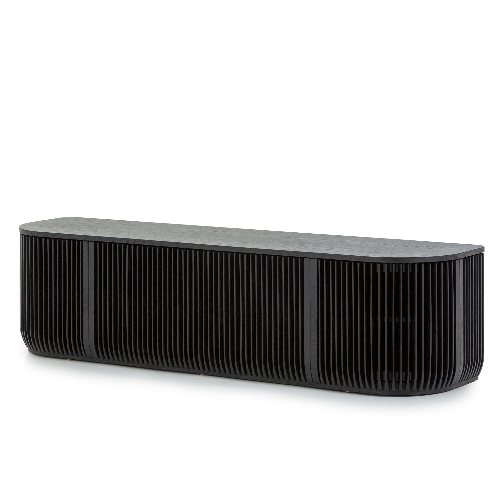Emphasizing clean lines and architectural presence, the Arvena 1.75m TV Entertainment Unit in Black Stain features softened edges that balance its bold silhouette. This detail enhances its contemporary appeal while allowing it to blend effortlessly into diverse interiors.