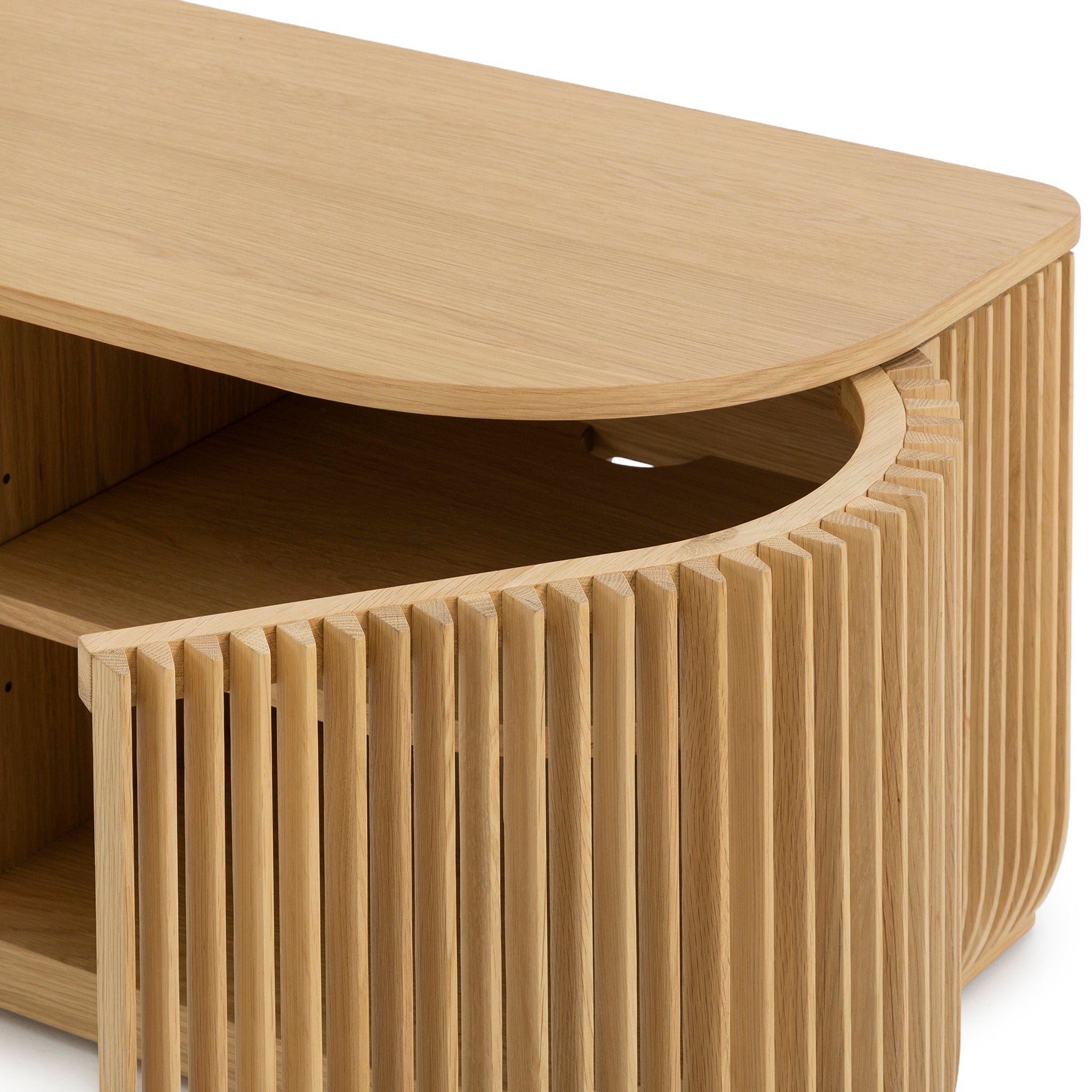 - Sleek doors open to generous shelving and concealed storage