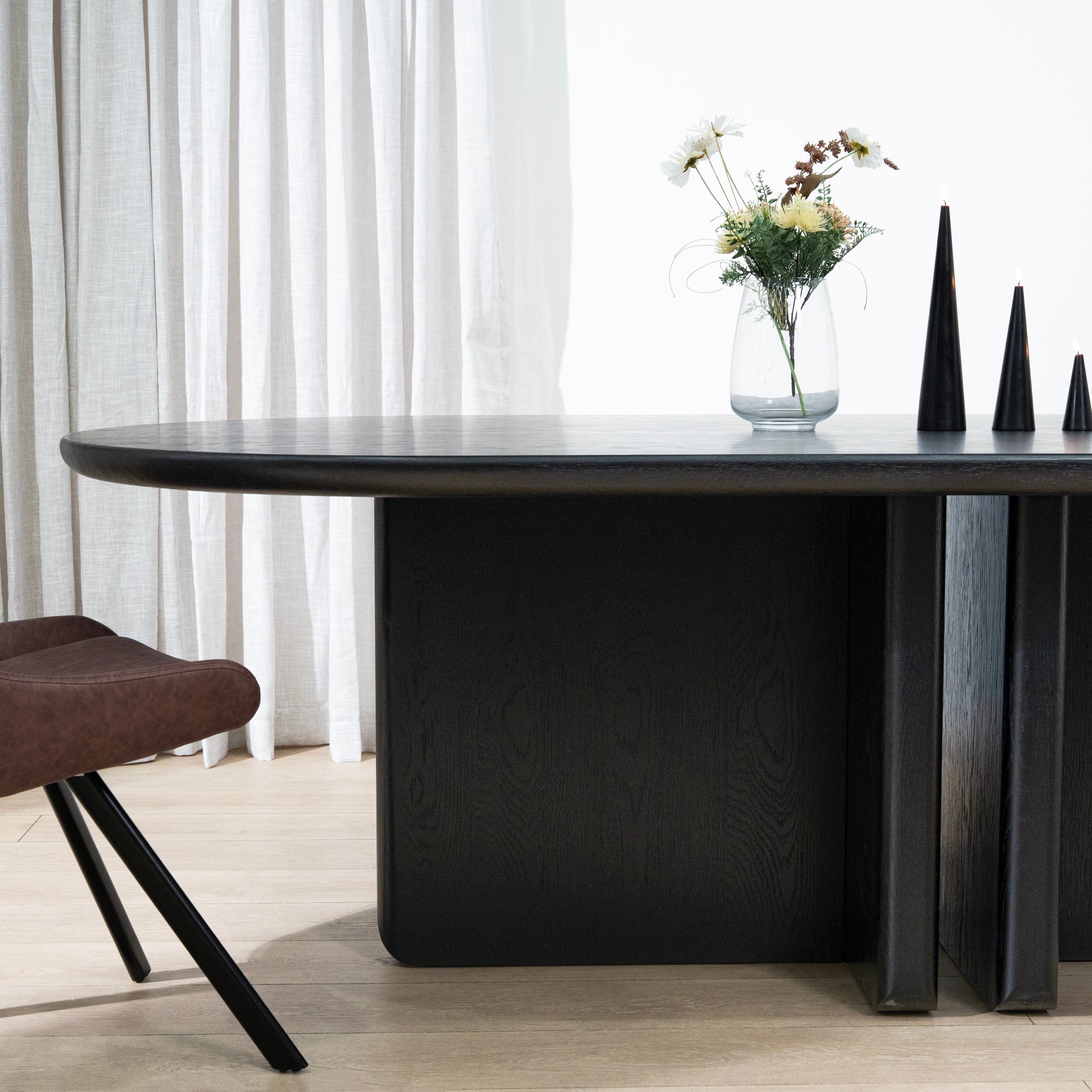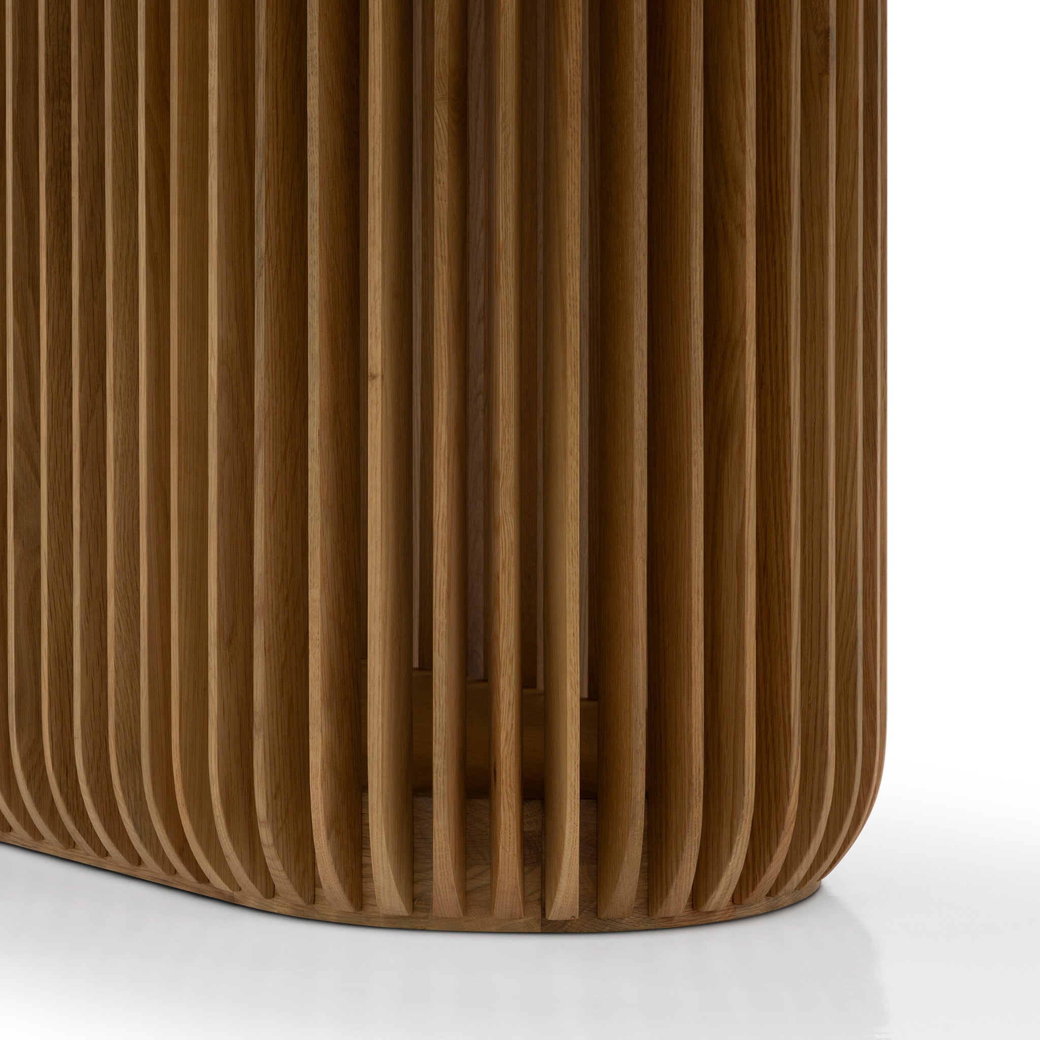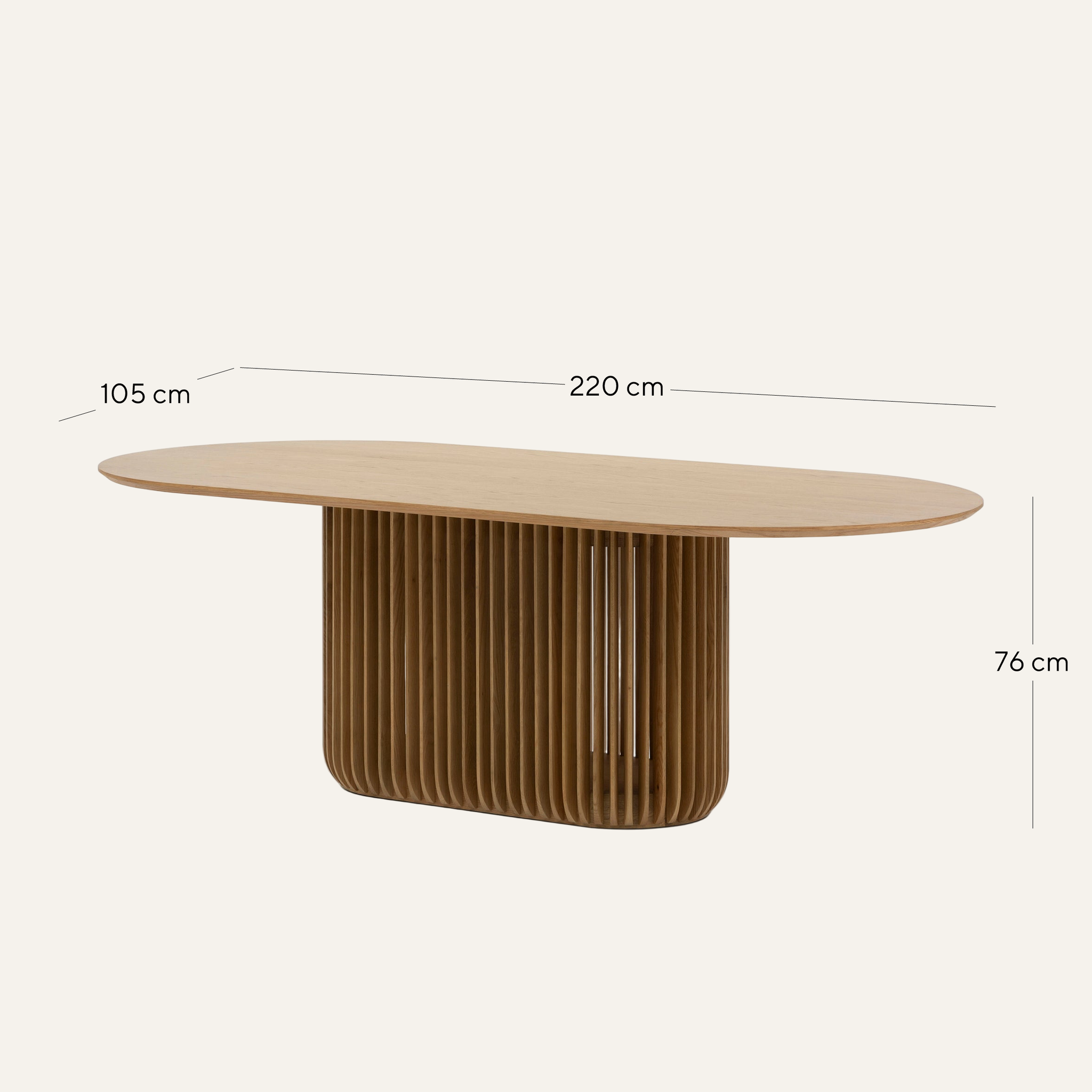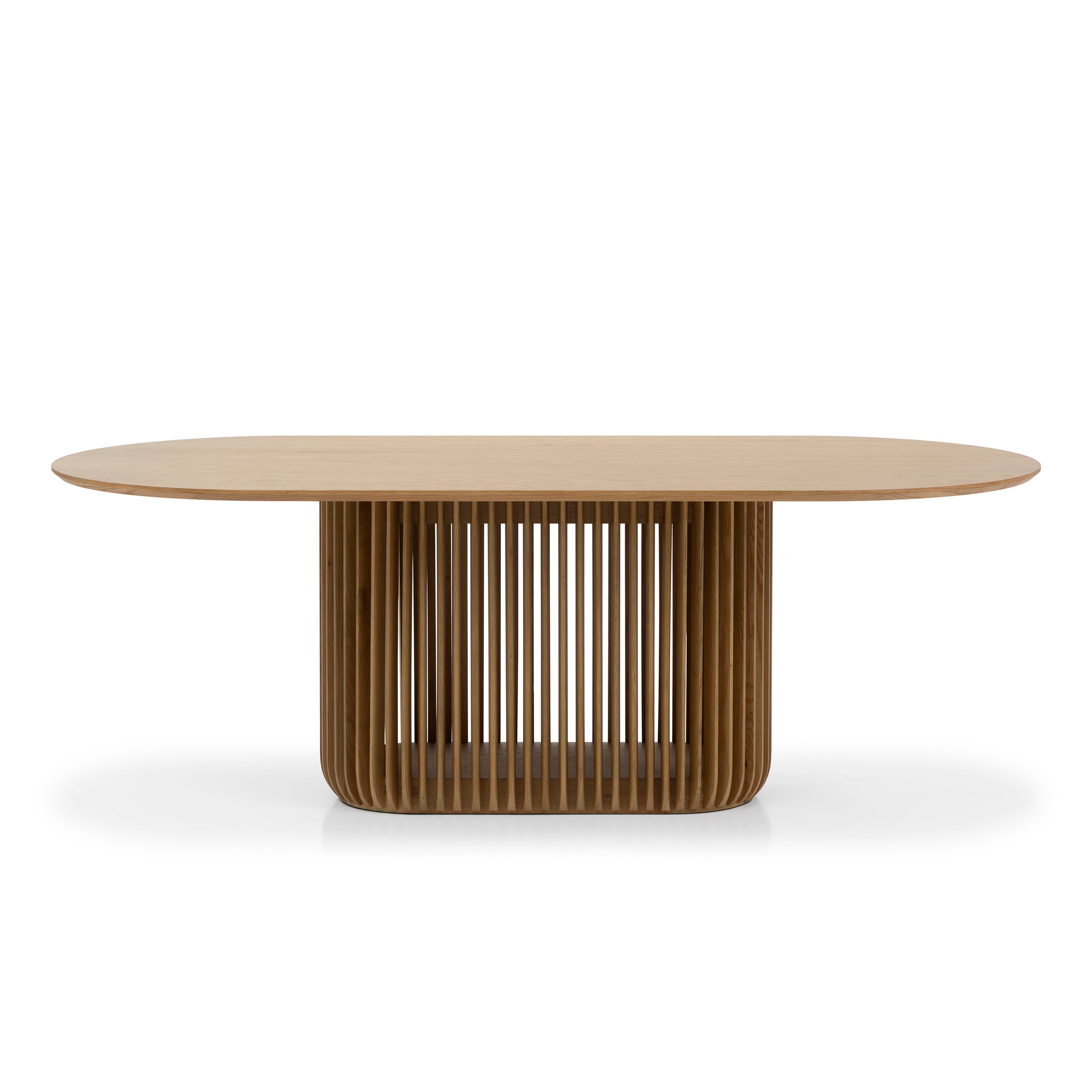 Designed for both style and function, the Arvena 2.2m Oval Dining Table in Natural rests on a distinctive slatted pedestal base that not only adds architectural interest but also ensures robust stability. The vertical slat detailing introduces a rhythmic, sculptural element, making the base as visually captivating as it is practical.