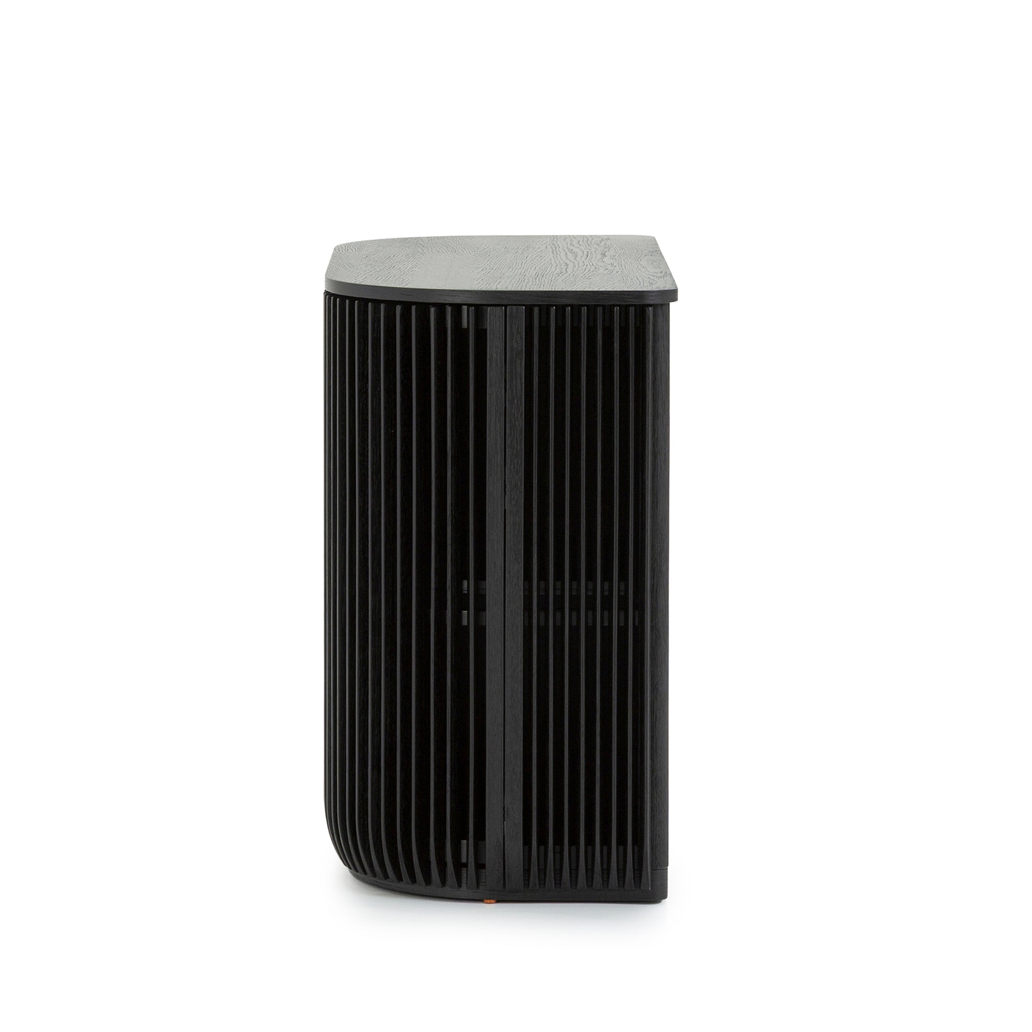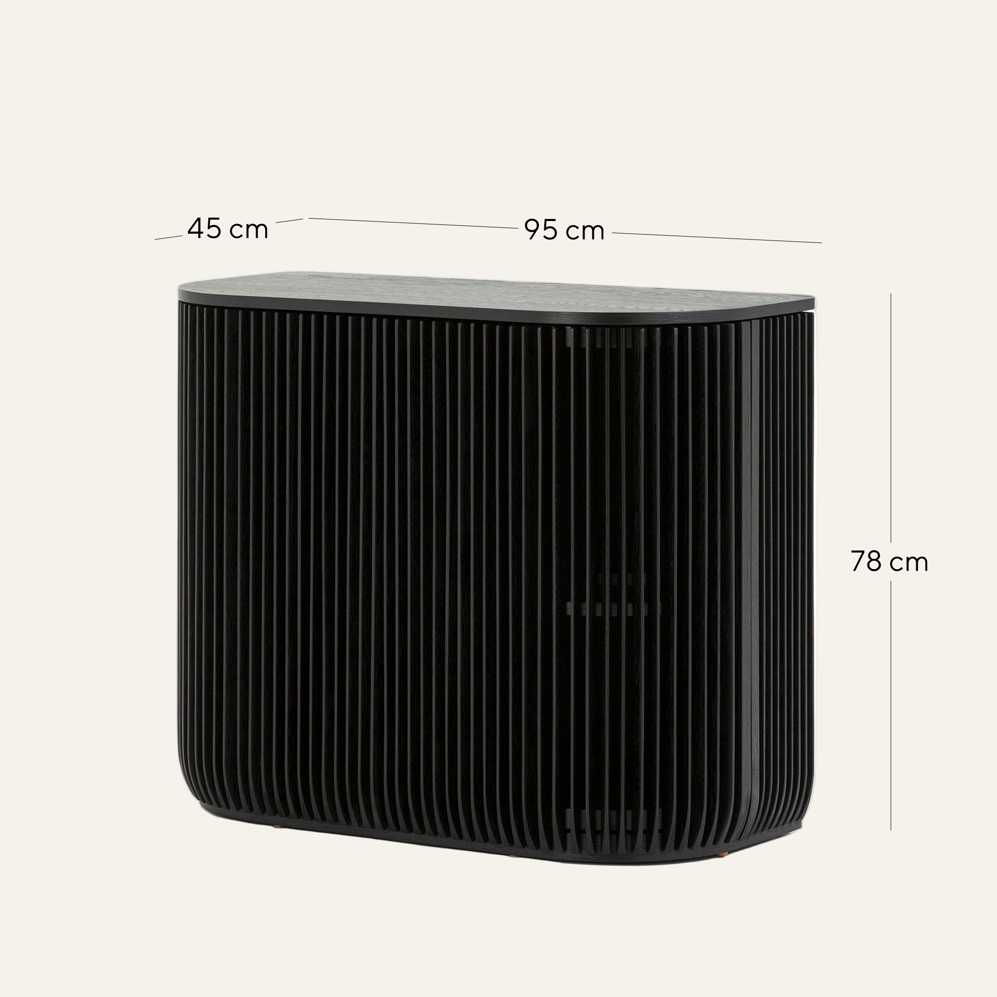 Behind its striking exterior, the Arvena 95cm Sideboard Unit in Black Stain reveals generous shelving and concealed compartments for organized, clutter-free storage, blending elegance with utility in a sleek, polished form.