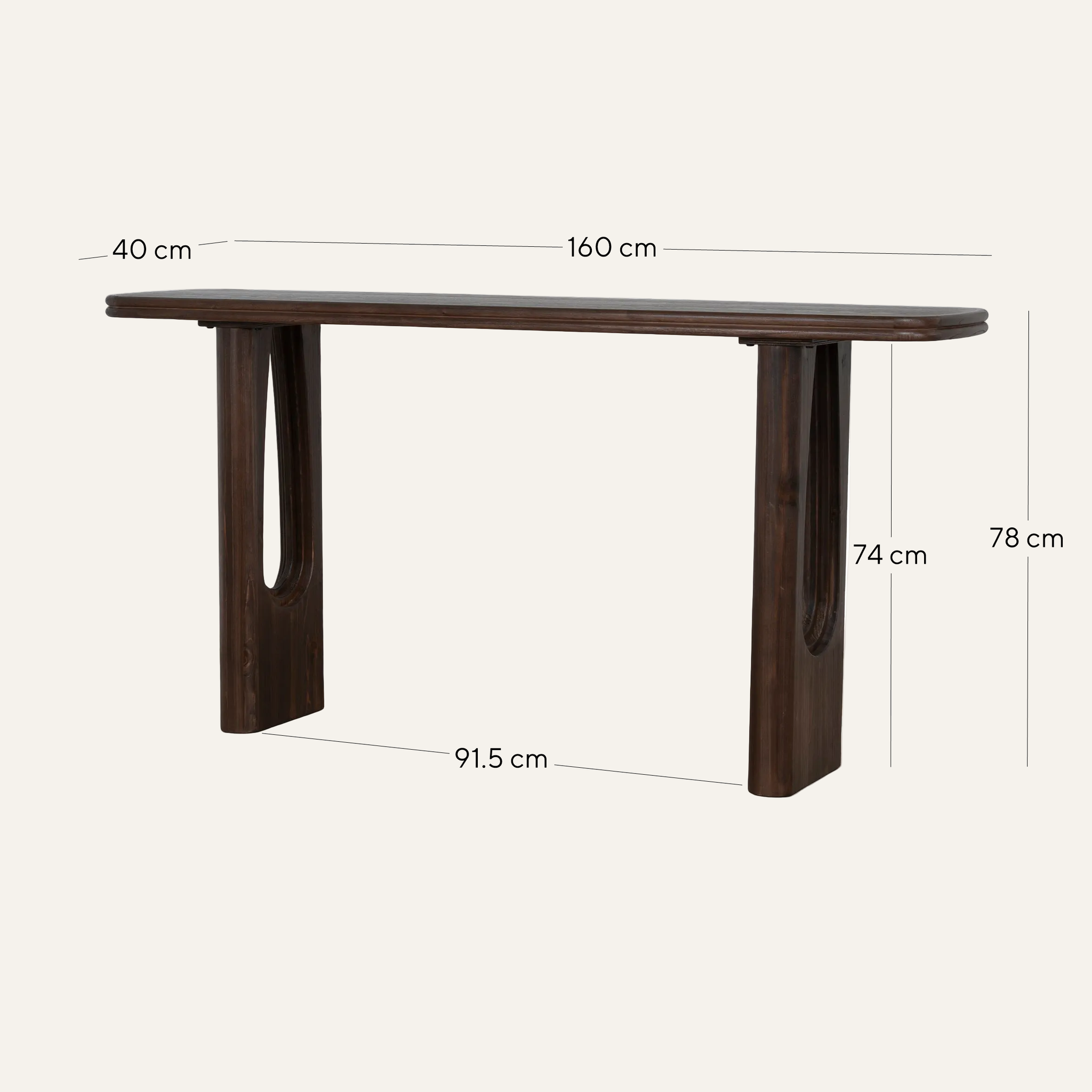 Overall: 160cm (W) x 40cm (D) x 78cm (H) Distance between legs: 91.5cm Leg Height: 74cm