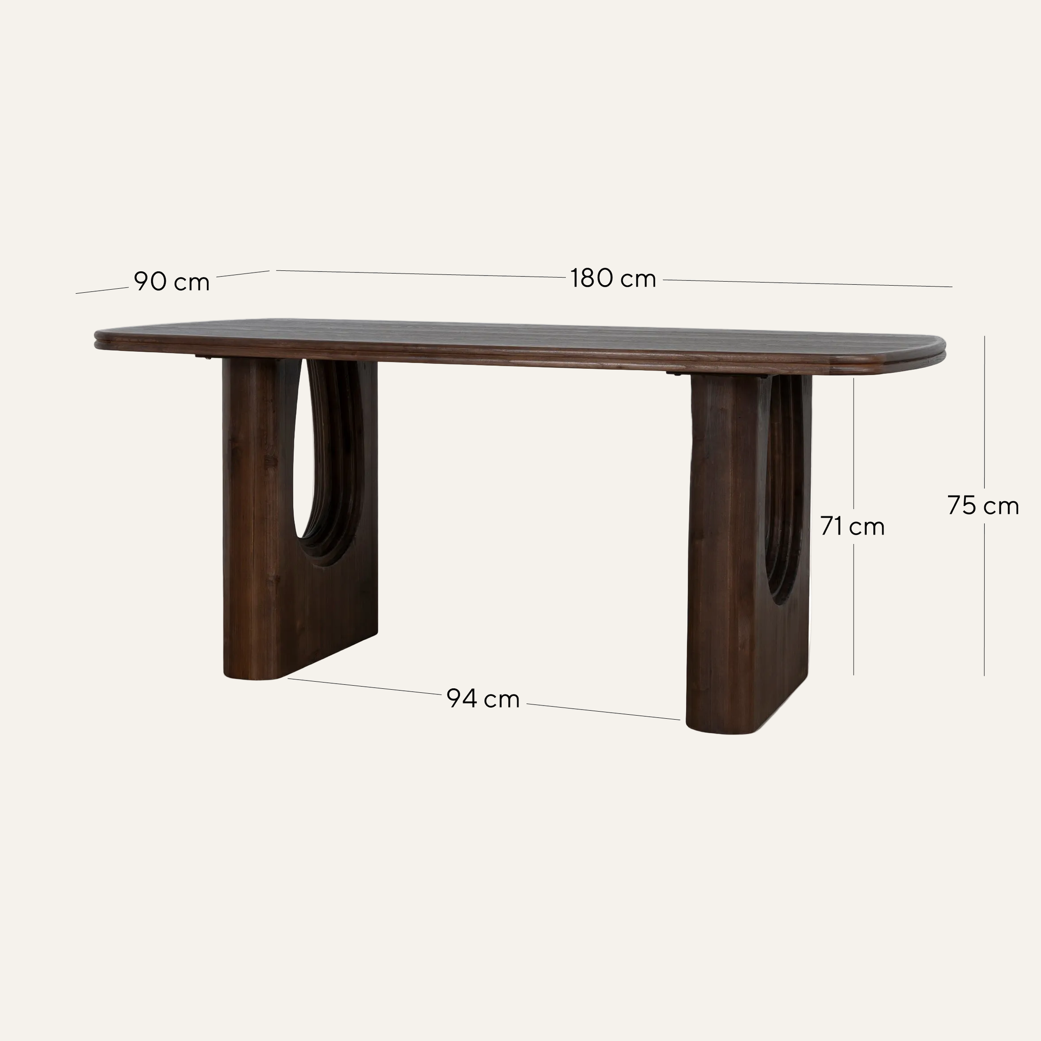 Overall: 180cm (W) x 90cm (D) x 75cm (H) Distance between legs: 94cm Leg Height: 71cm