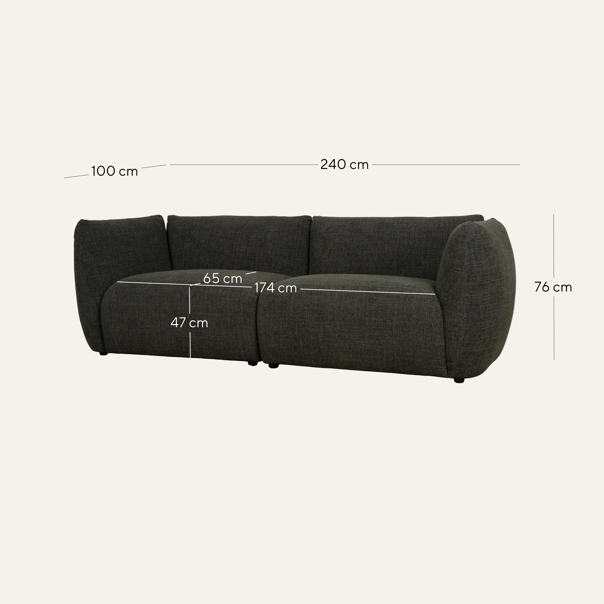 Overall: 240cm (W) x 100cm (D) x 76cm (H) Seat: 174cm (W) x 65cm (D) x 47cm (H) Arm Height: 76cm Leg Height: 3cm