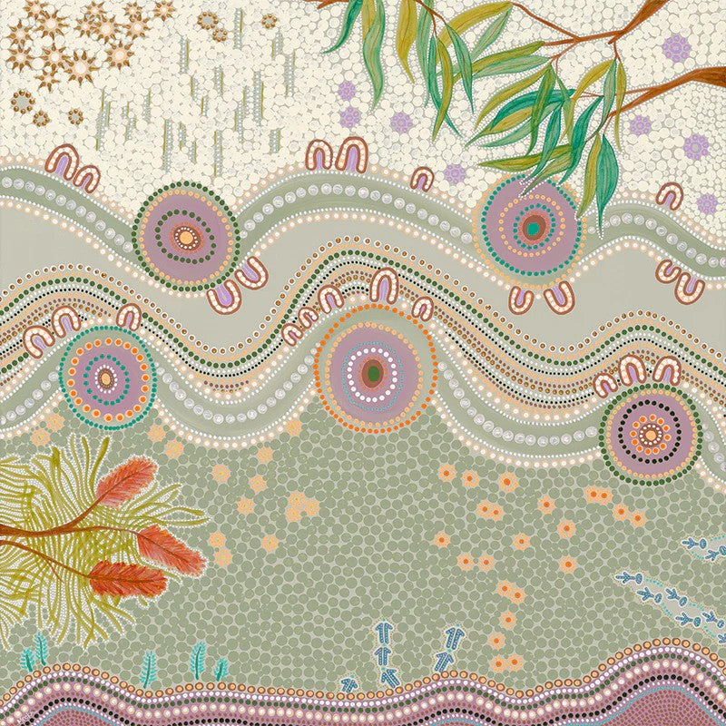Celebrate nature's magic with this whimsical artwork by Domica Hill. Intricate dots dance across sage, peach and lilac, weaving native botanicals and flowing pathways that whisper of growth and seasonal renewal.