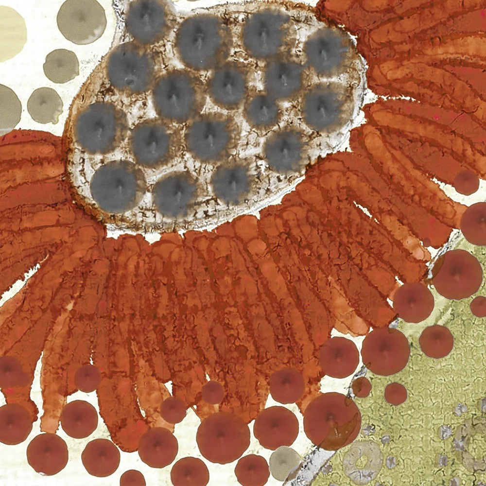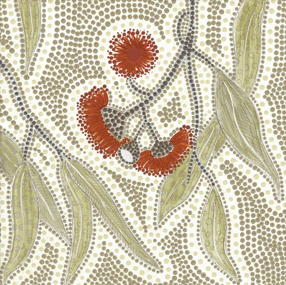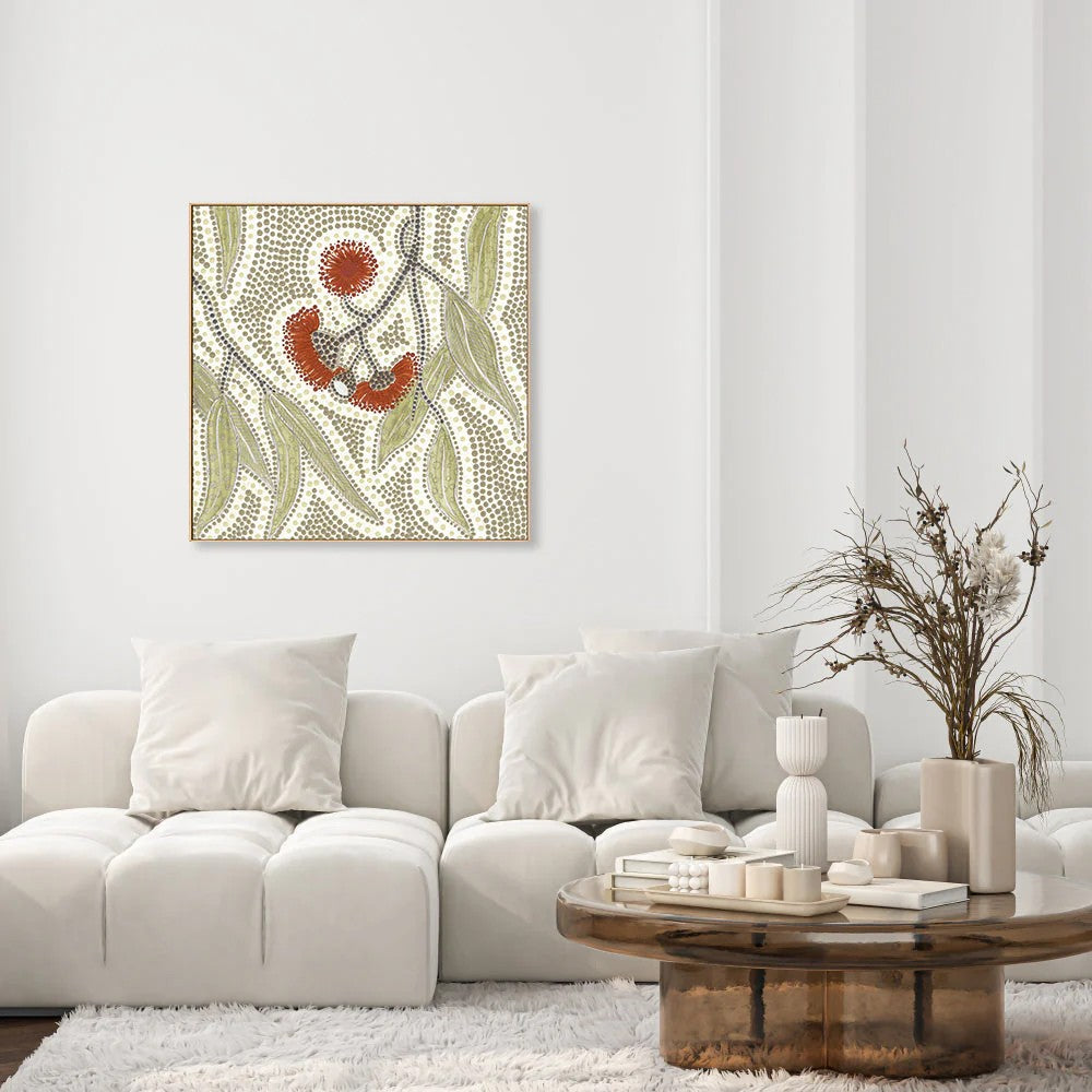 Delicate native blossoms and flowing leaves rendered in intricate dot patterns. Soft earthy greens with warm red accents create a balanced botanical composition. Framed and ready to hang.