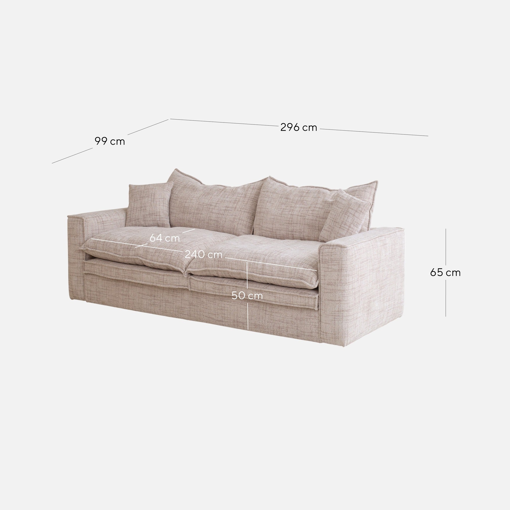 Overall: 296cm (W) x 99cm (D) x 65cm (H) Seat: 240cm (W) x 64cm (D) x 50cm (H) Leg Height: 3cm Armrest Height: 65cm