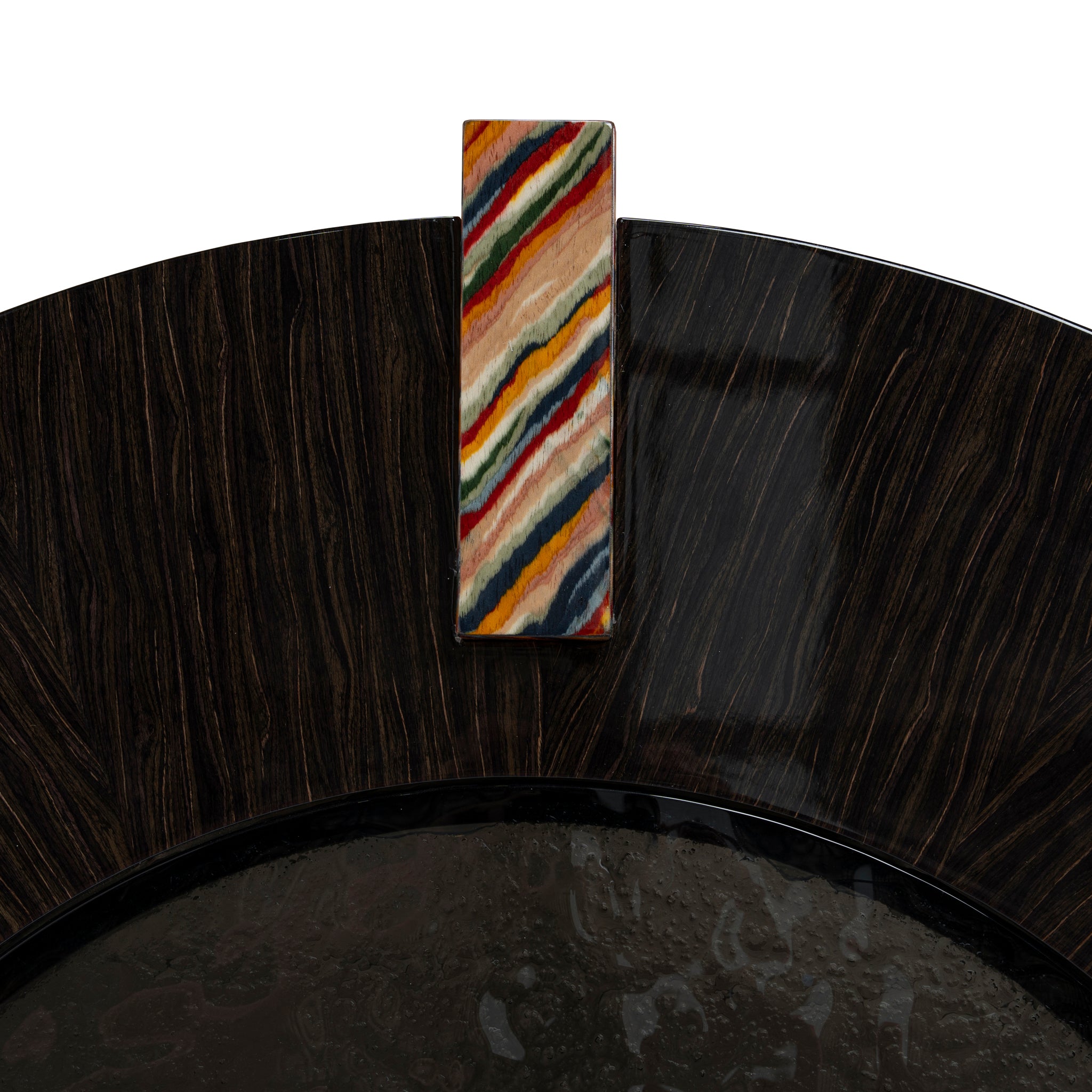- Bold contrast between glossy black top and multicolored legs