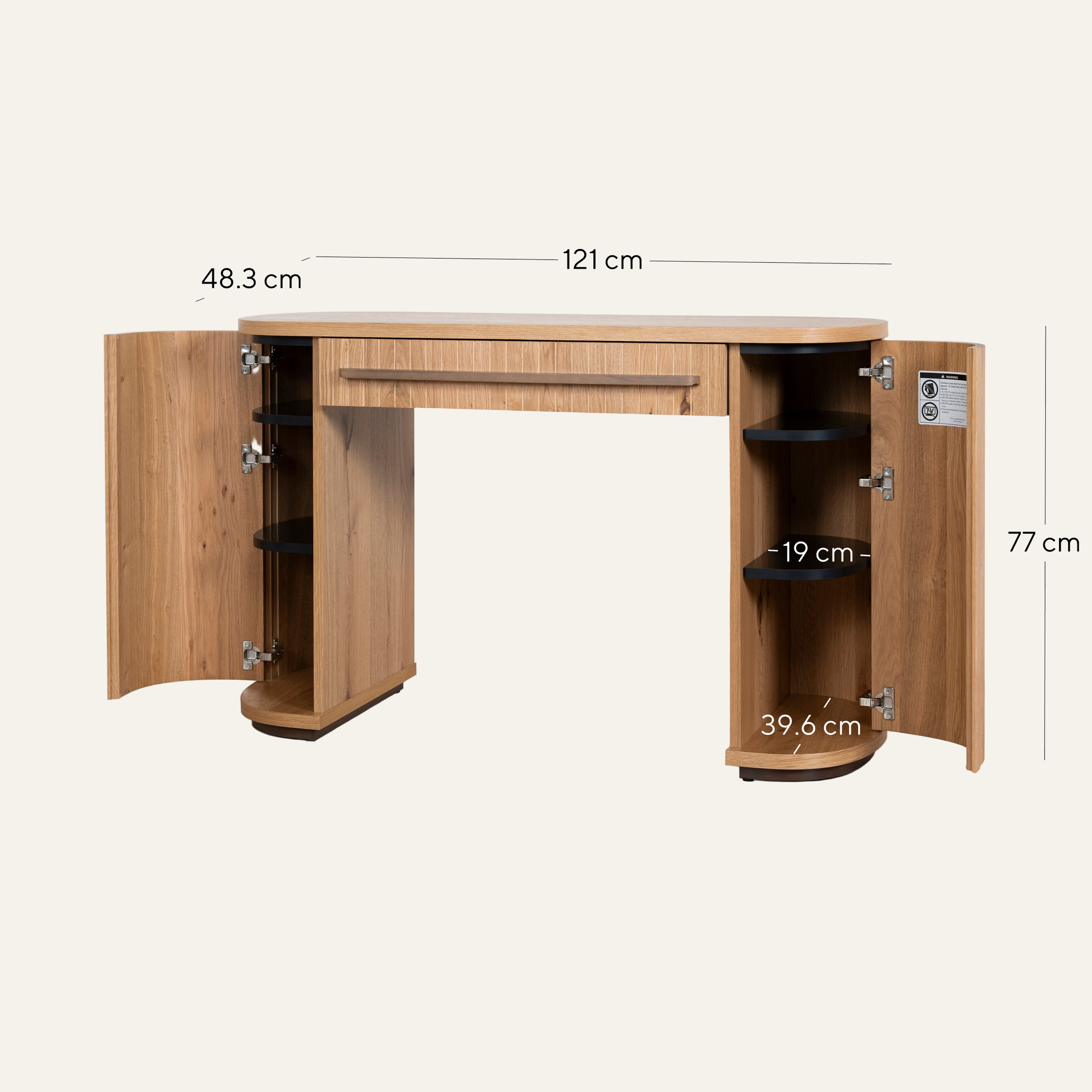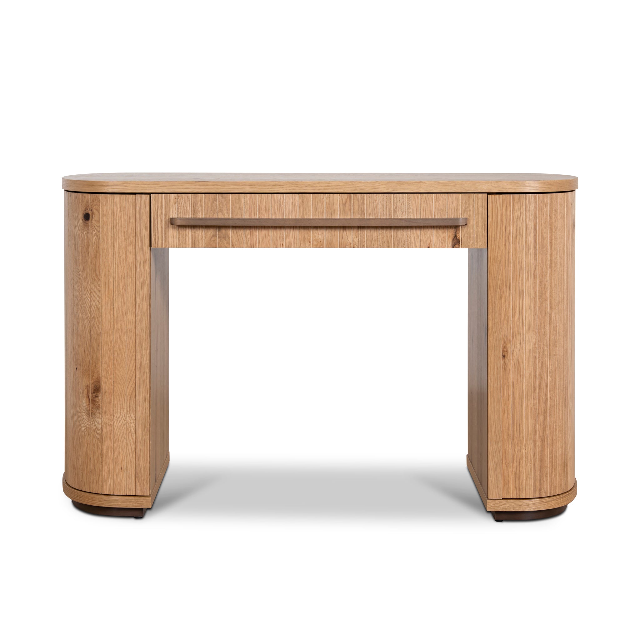 Functionality is at the core of the Cambrio Dressing Table in Knotty Oak. A wide tabletop offers ample space for daily essentials, from beauty products to decorative accessories, while the smooth drawer ensures clutter-free organization.