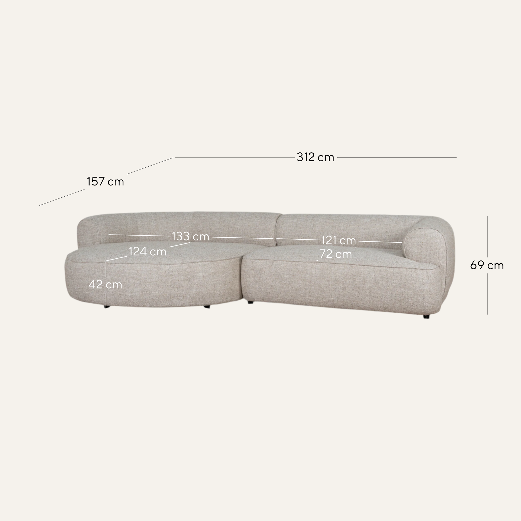 Overall: 312cm (W) x 157cm (D) x 69cm (H) Sofa Seat: 121cm (W) x 72cm (D) x 42cm (H) Chase Seat: 133cm (W) x 124cm (D) x 42cm (H) Leg Height: 5cm