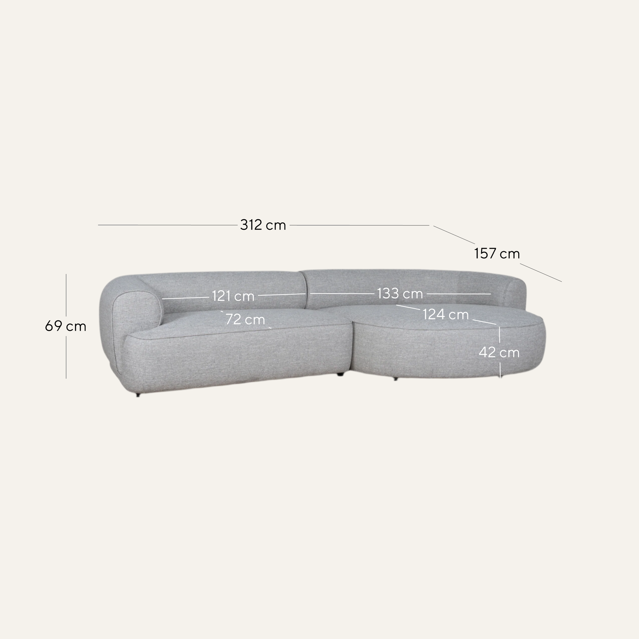 Overall: 312cm (W) x 157cm (D) x 69cm (H) Sofa Seat: 121cm (W) x 72cm (D) x 42cm (H) Chase Seat: 133cm (W) x 124cm (D) x 42cm (H) Leg Height: 5cm