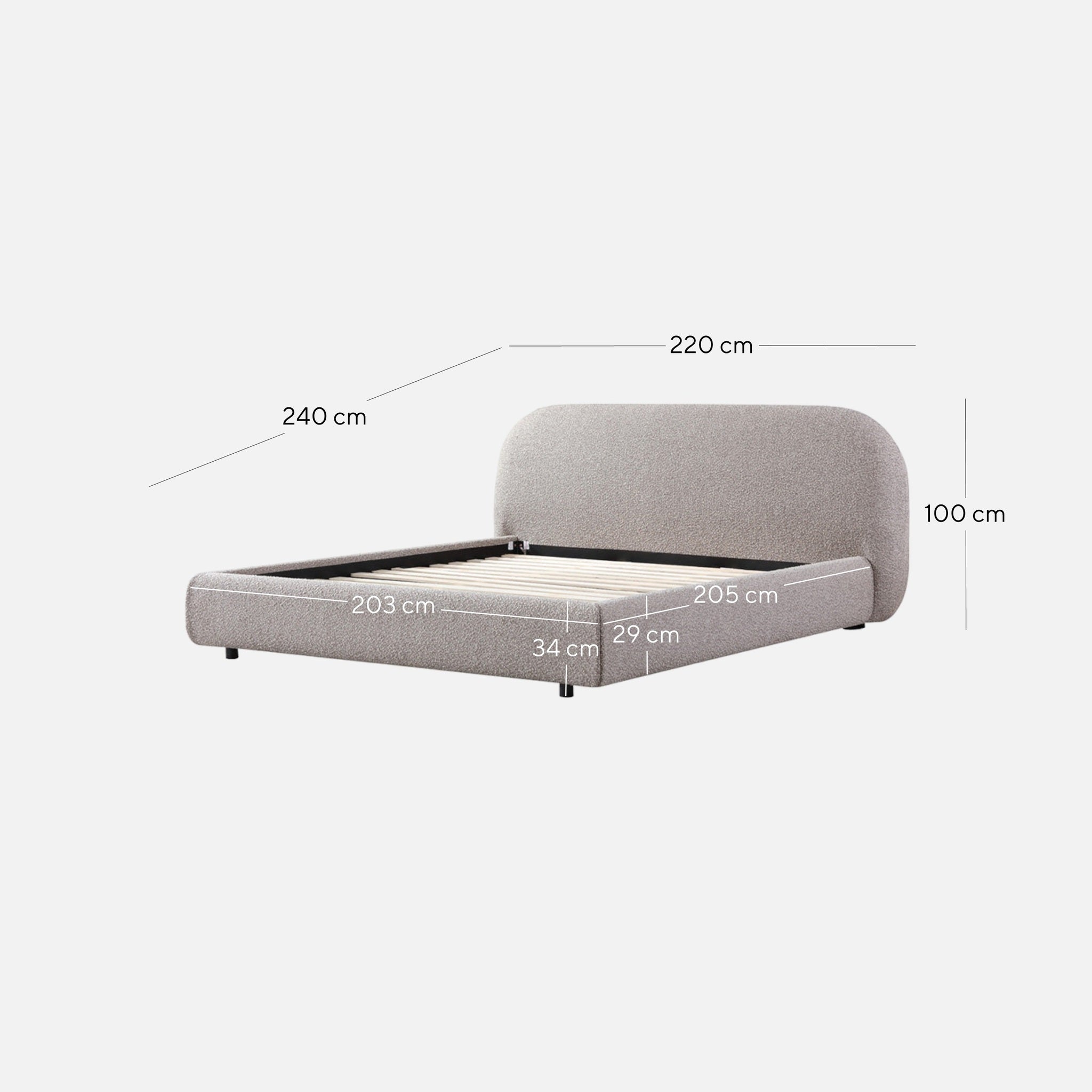 Overall: 220cm (W) x 240cm (D) x 100cm (H) Bedhead: 220cm (W) x 30cm (D) x 95cm (H) Sideboard: 205cm (W) x 9cm (D) x 29cm (H) Footboard: 203cm (W) x 9cm (D) x 34cm (H)