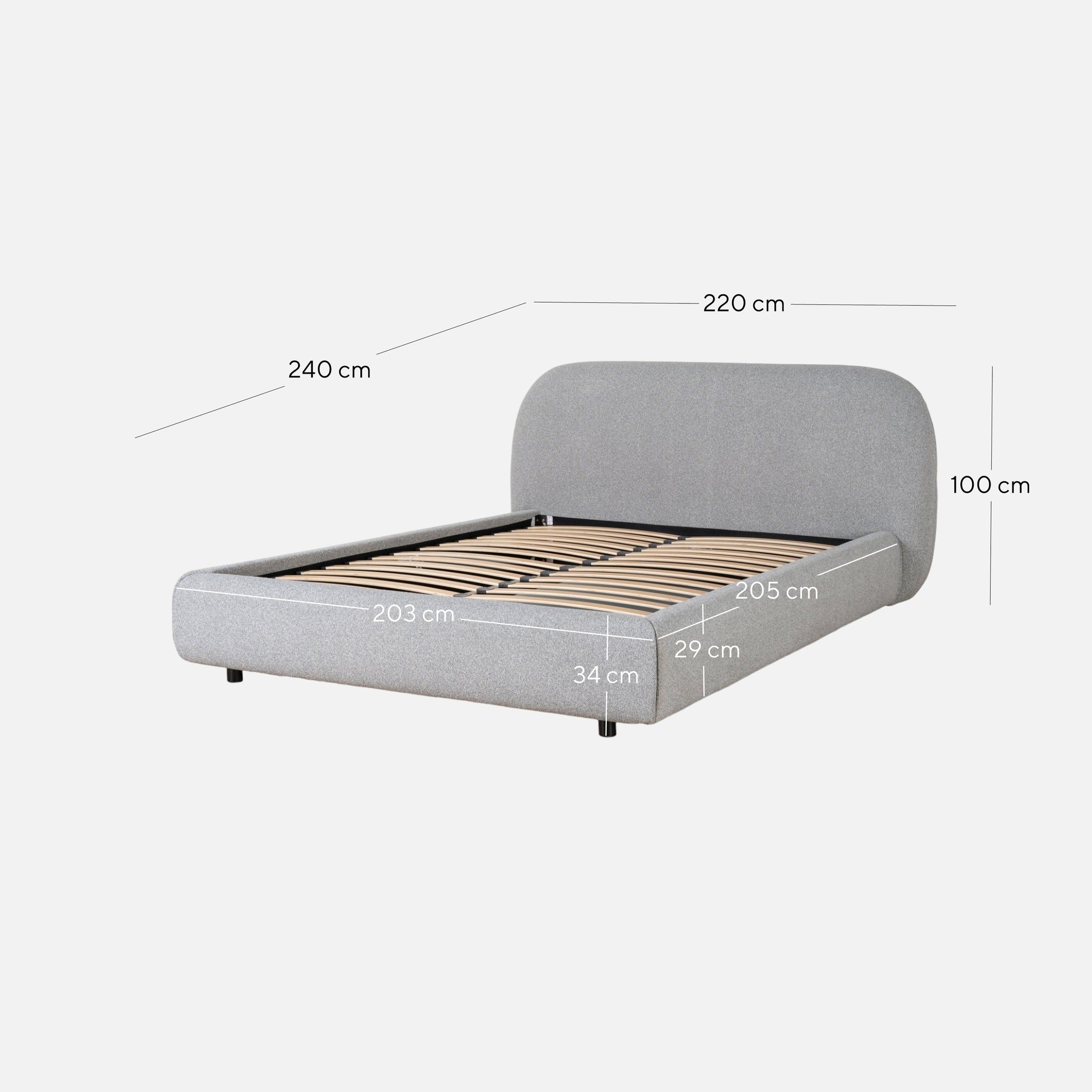 Overall: 220cm (W) x 240cm (D) x 100cm (H) Bedhead: 220cm (W) x 30cm (D) x 95cm (H) Sideboard: 205cm (W) x 9cm (D) x 29cm (H) Footboard: 203cm (W) x 9cm (D) x 34cm (H)