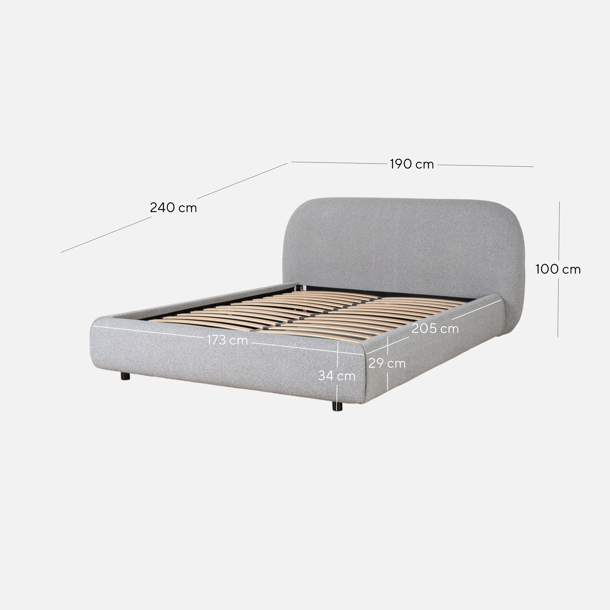 Overall: 190cm (W) x 240cm (D) x 100cm (H) Bedhead: 190cm (W) x 30cm (D) x 95cm (H) Sideboard: 205cm (W) x 9cm (D) x 29cm (H) Footboard: 173cm (W) x 9cm (D) x 34cm (H)