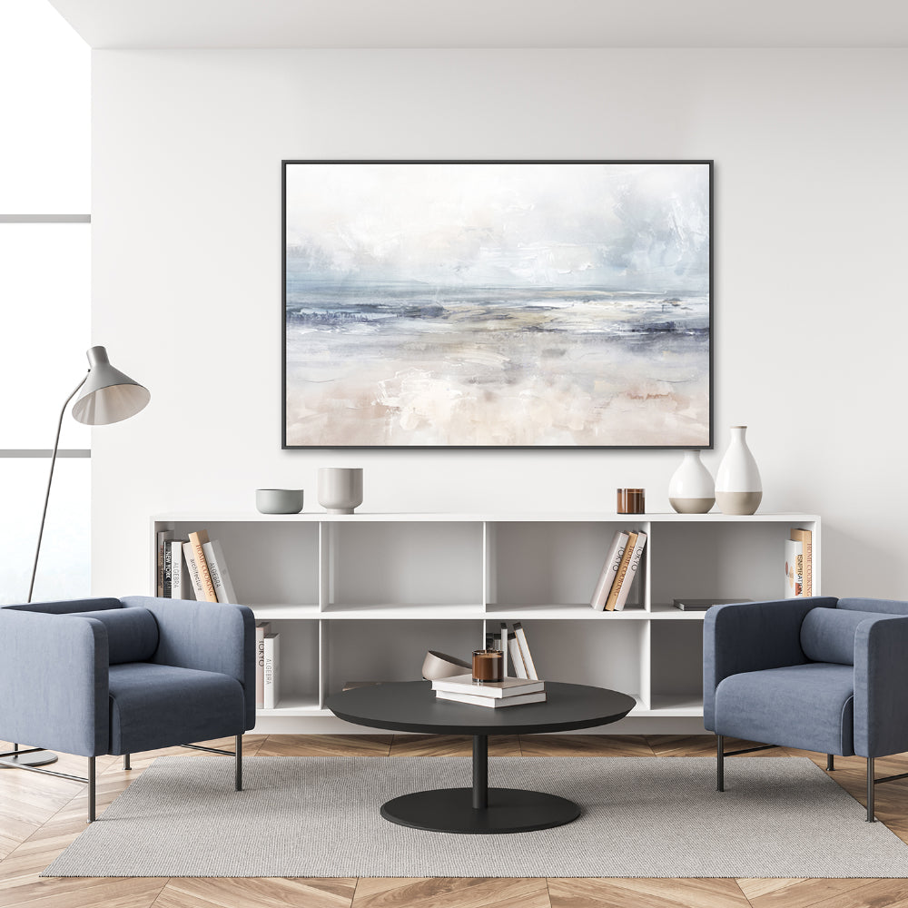 Experience the tranquility of Coastal Breeze by Nina Blue. Add this serene coastal artwork to your space for a sense of calm. Printed and framed by Gioia Wall Art, it showcases soft brushstrokes and muted tones, capturing the peaceful beauty of the shoreline.