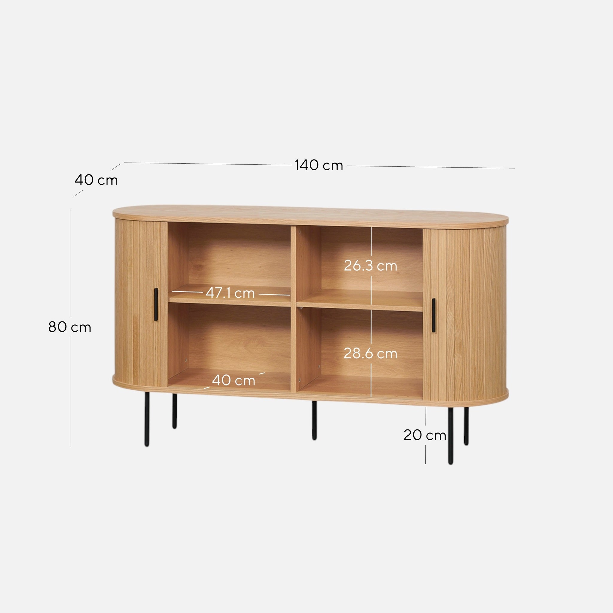 Overall: 140cm (W) x 40cm (D) x 80cm (H) Internal shelves: Top: 47.1cm (W) x 40cm (D) x 26.3cm (H) Bottom: 47.1cm (W) x 40cm (D) x 28.6cm (H) Leg Height: 20cm