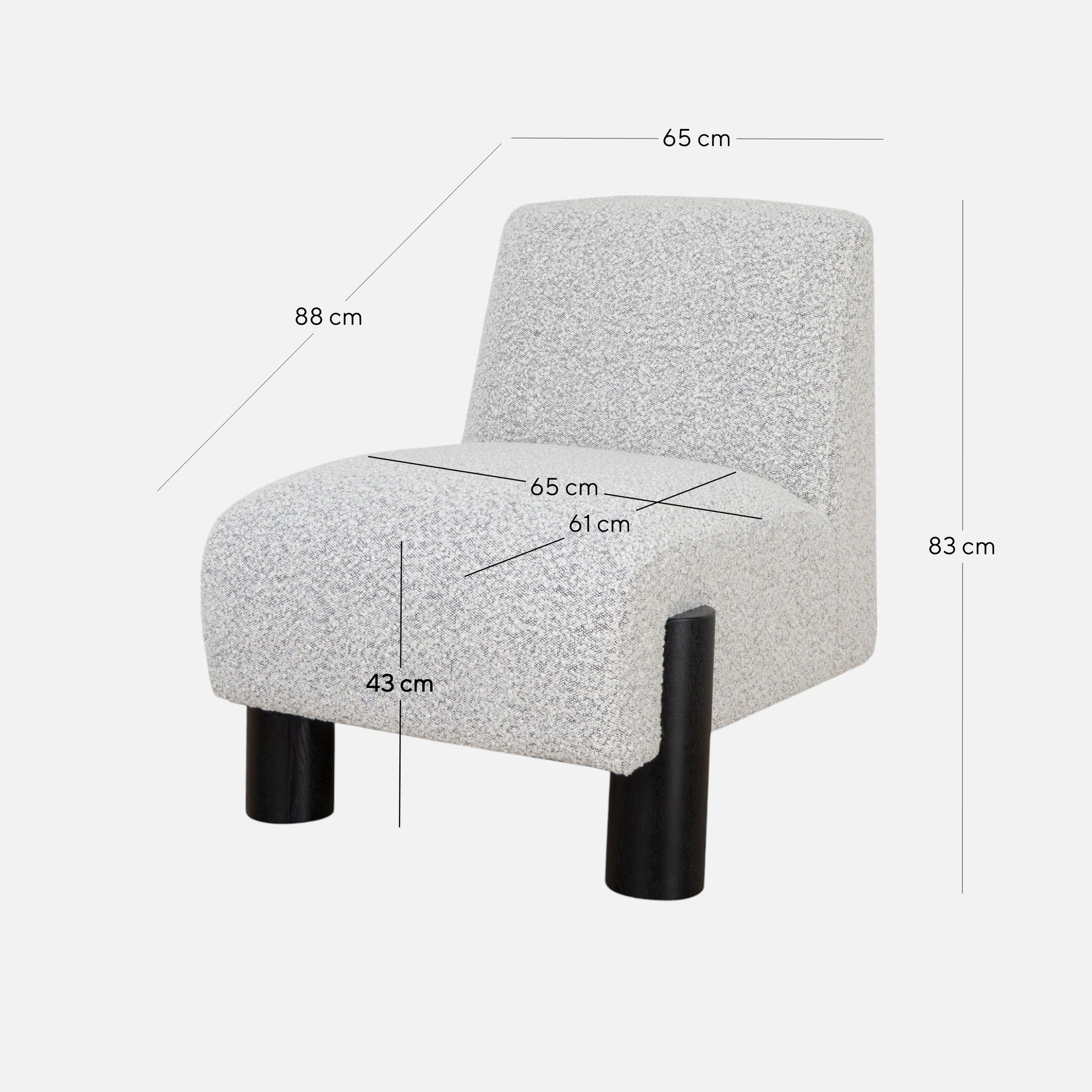 Overall: 65cm (W) x 88cm (D) x 83cm (H) Seat: 65cm (W) x 61cm (D) x 43cm (H) Leg Height: 21cm