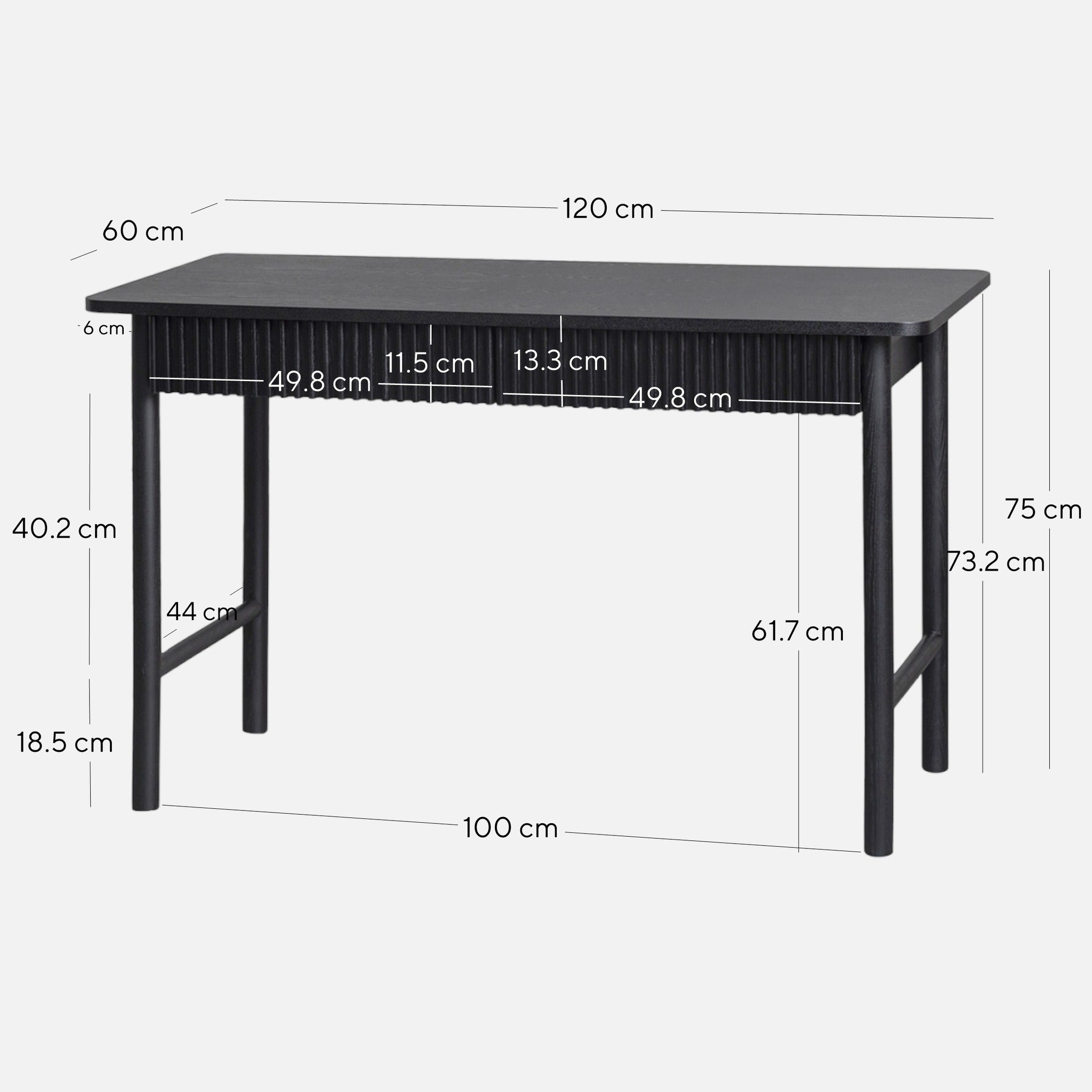 Overall: 120cm (W) x 60cm (D) x 75cm (H) Distance between Legs: 100cm (W) x 44cm (D) table Top Hanging: 6cm Leg Height: 61.7cm Desk Top Height: 13.3cm