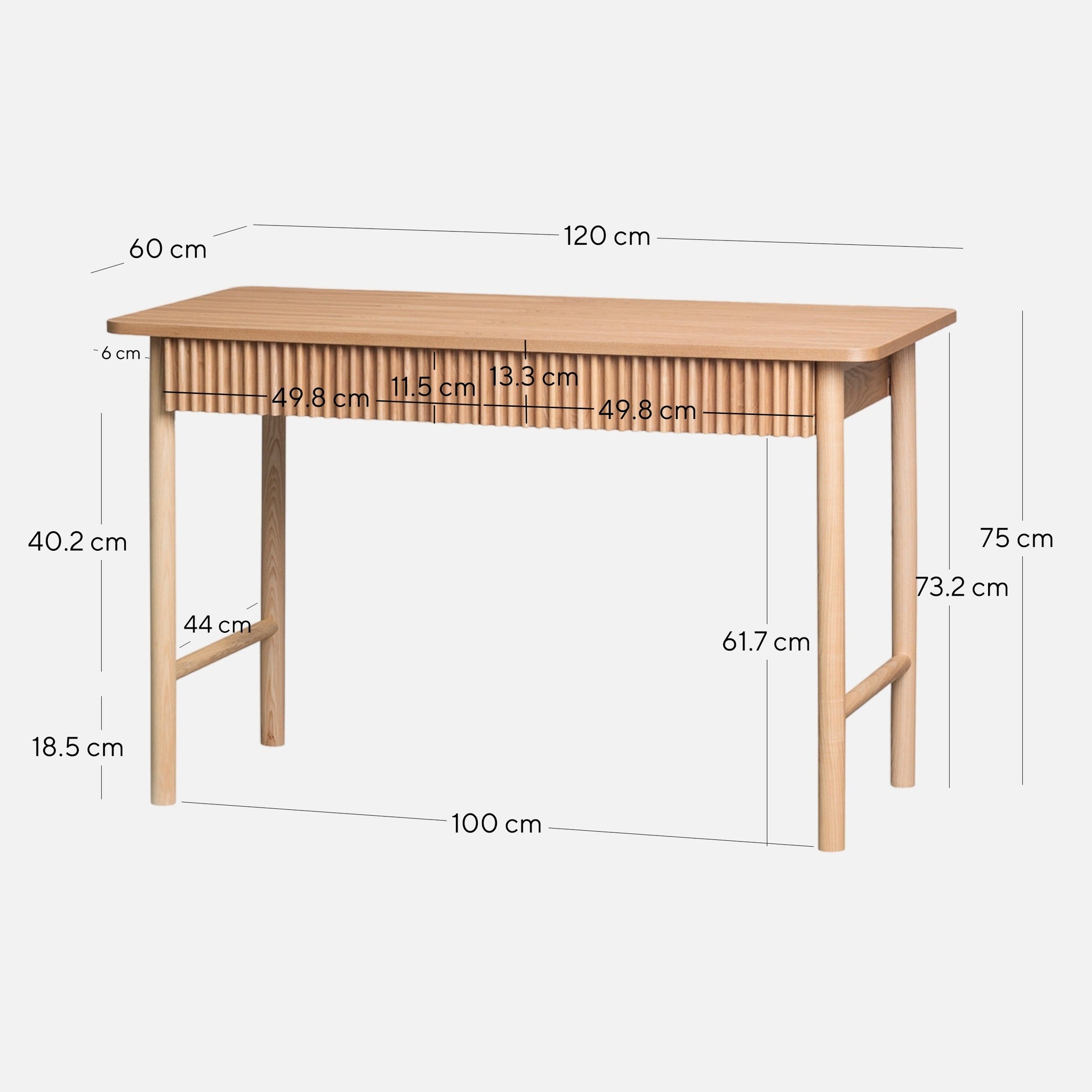 Overall: 120cm (W) x 60cm (D) x 75cm (H) Distance between Legs: 100cm (W) x 44cm (D) table Top Hanging: 6cm Leg Height: 61.7cm Desk Top Height: 13.3cm