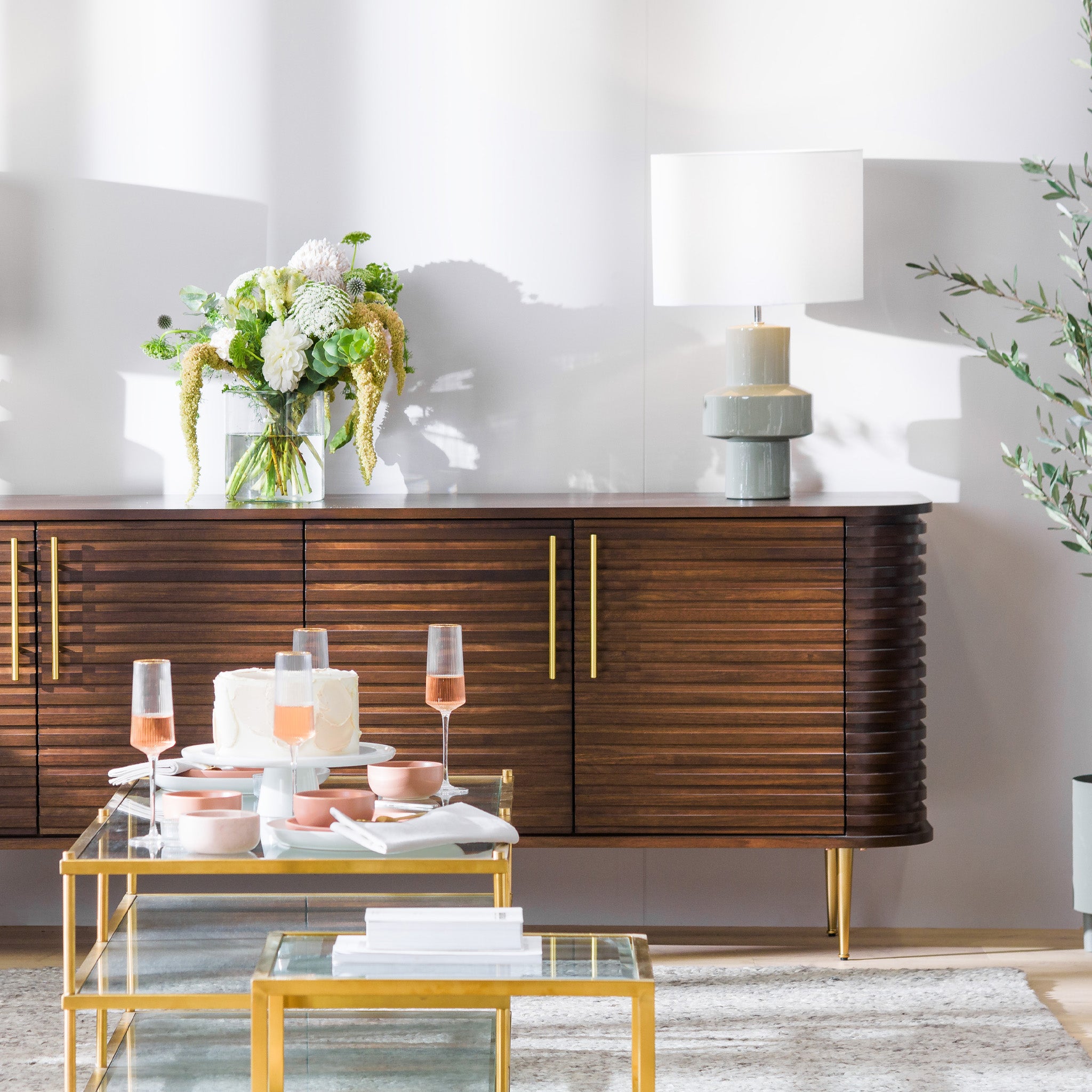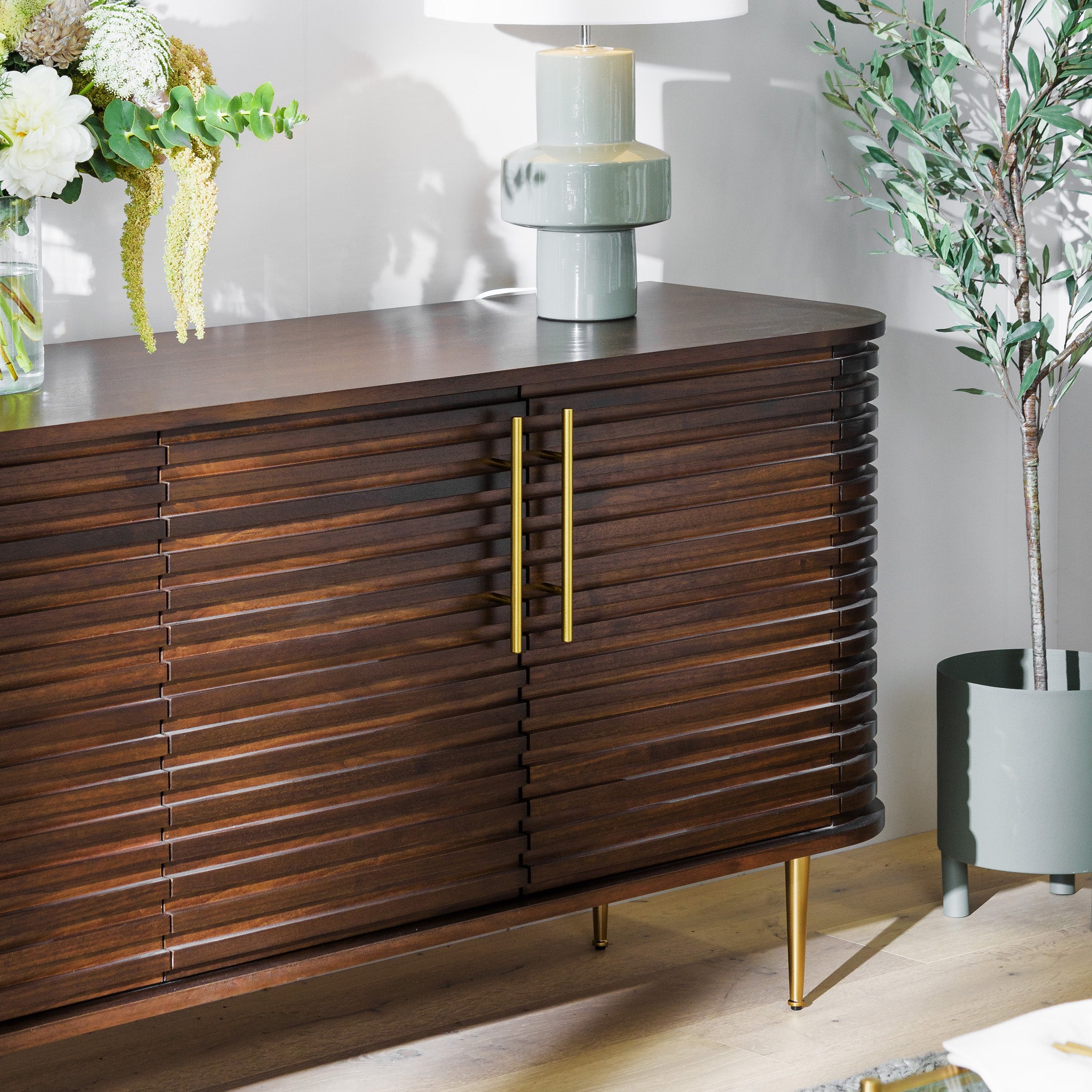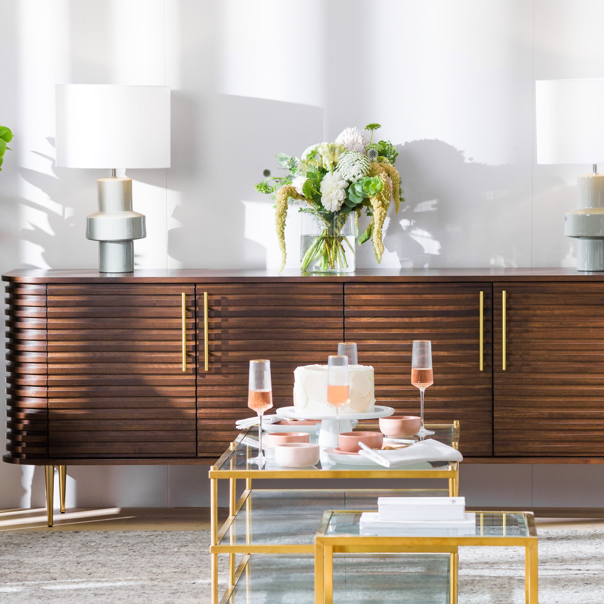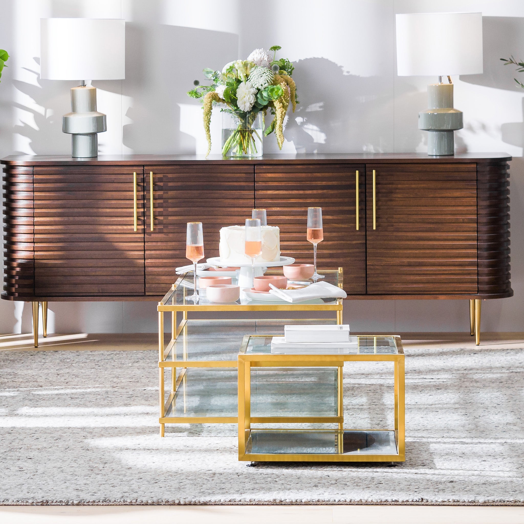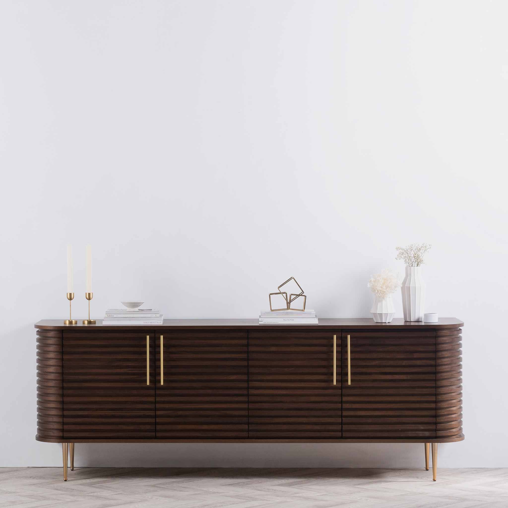Enhance your lounge room look and storage option with the luxurious build of Domenic 2.2m Buffet Unit - Walnut. The tapered base, brushed gold detailing and fluted design creates an inherently impressive unit, ready to elevate the home. Upgrade your lounge room with the luxurious build of buffets and sideboards, featuring elegant tapered bases, brushed gold detailing, and fluted designs that elevate your home decor.