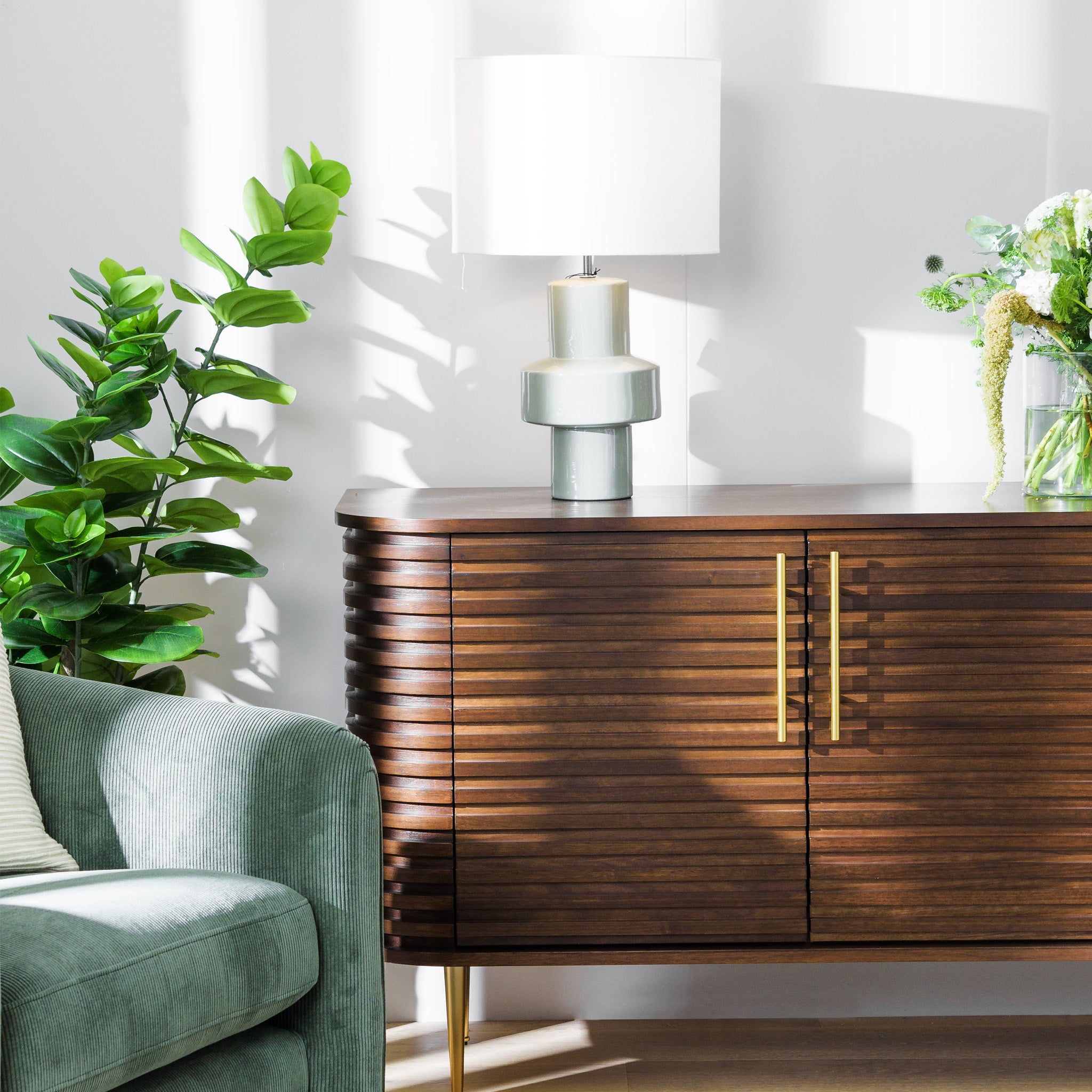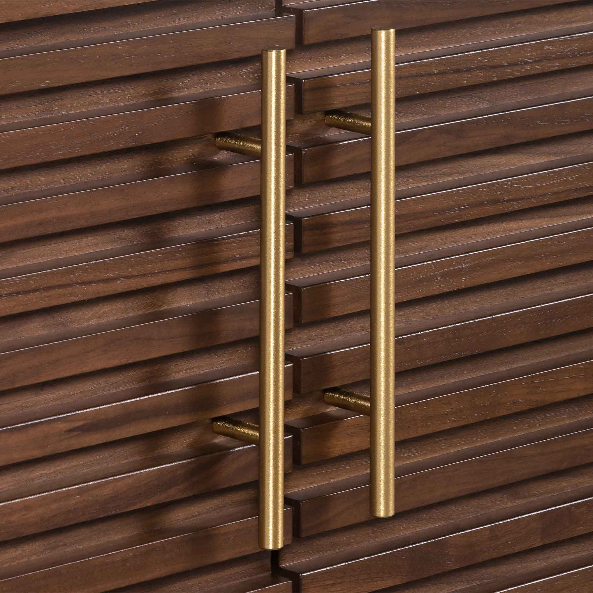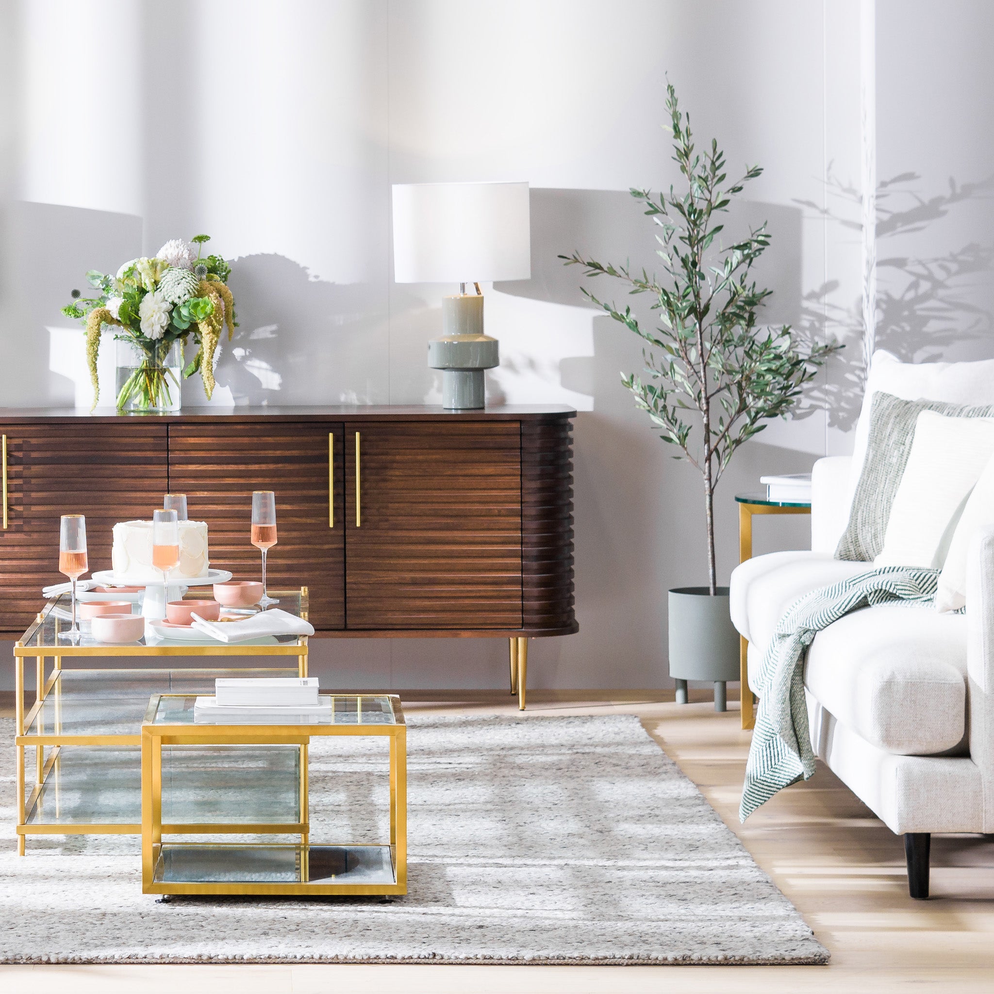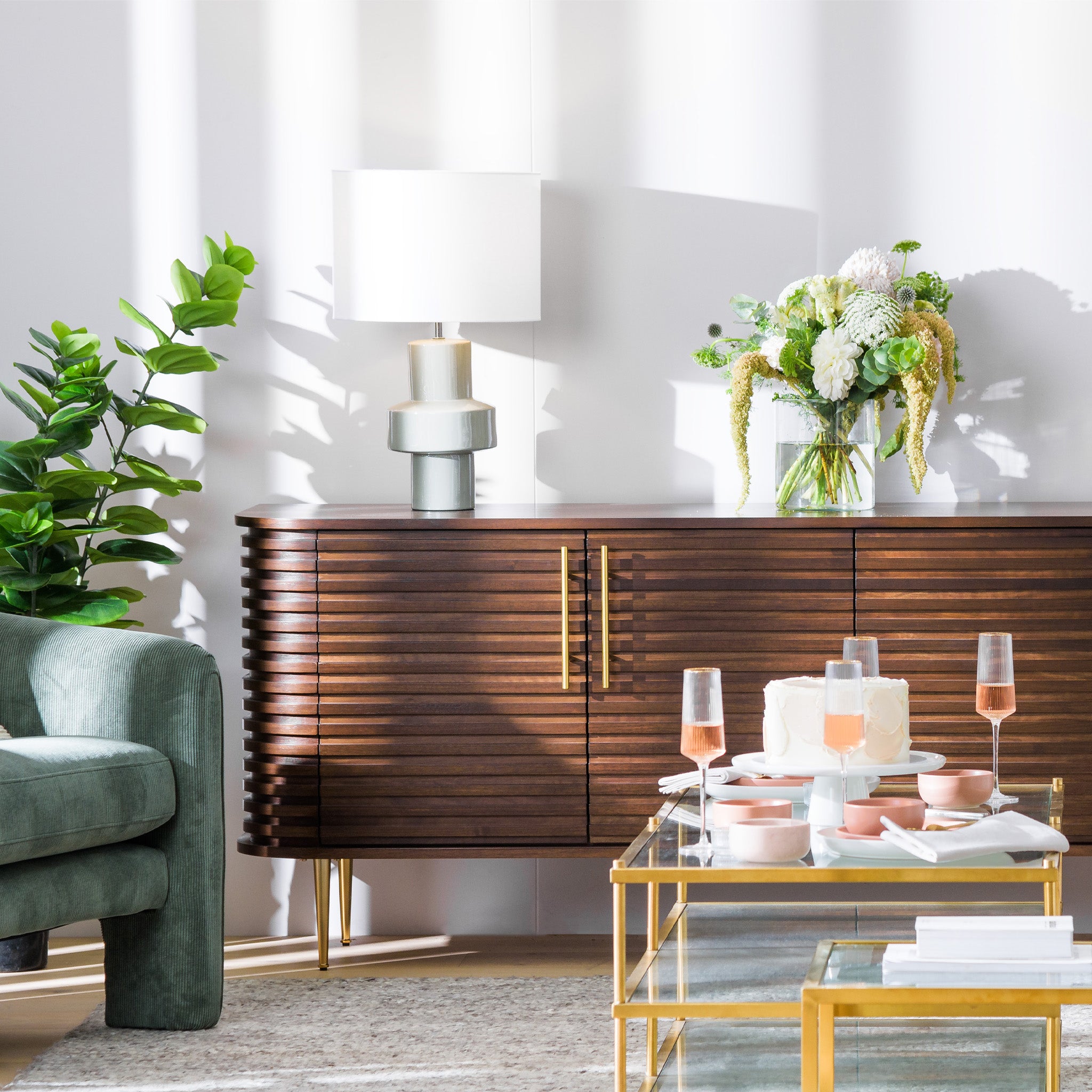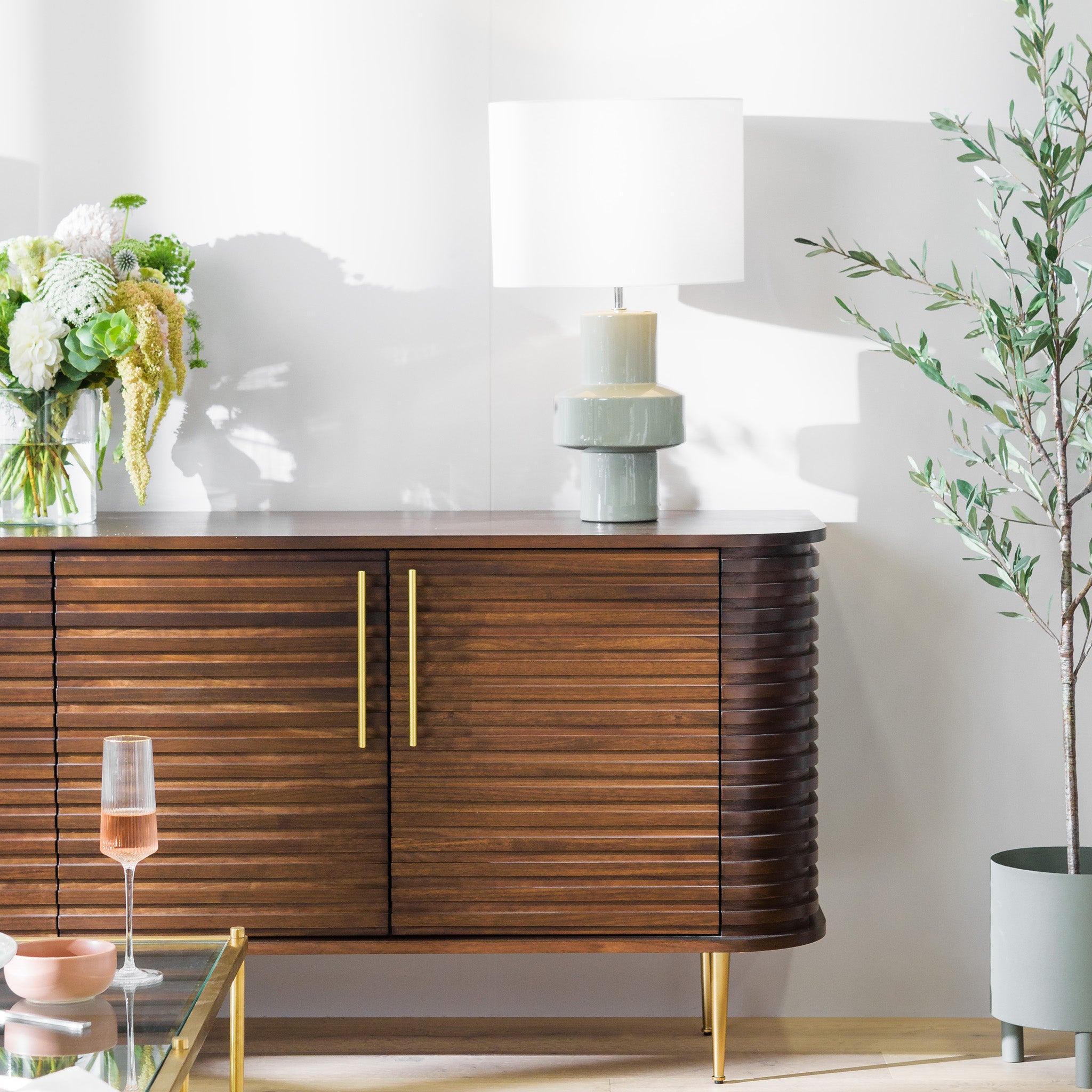 Enhance your lounge room look and storage option with the luxurious build of Domenic 2.2m Buffet Unit - Walnut. The tapered base, brushed gold detailing and fluted design creates an inherently impressive unit, ready to elevate the home. Upgrade your lounge room with the luxurious build of buffets and sideboards, featuring elegant tapered bases, brushed gold detailing, and fluted designs that elevate your home decor.