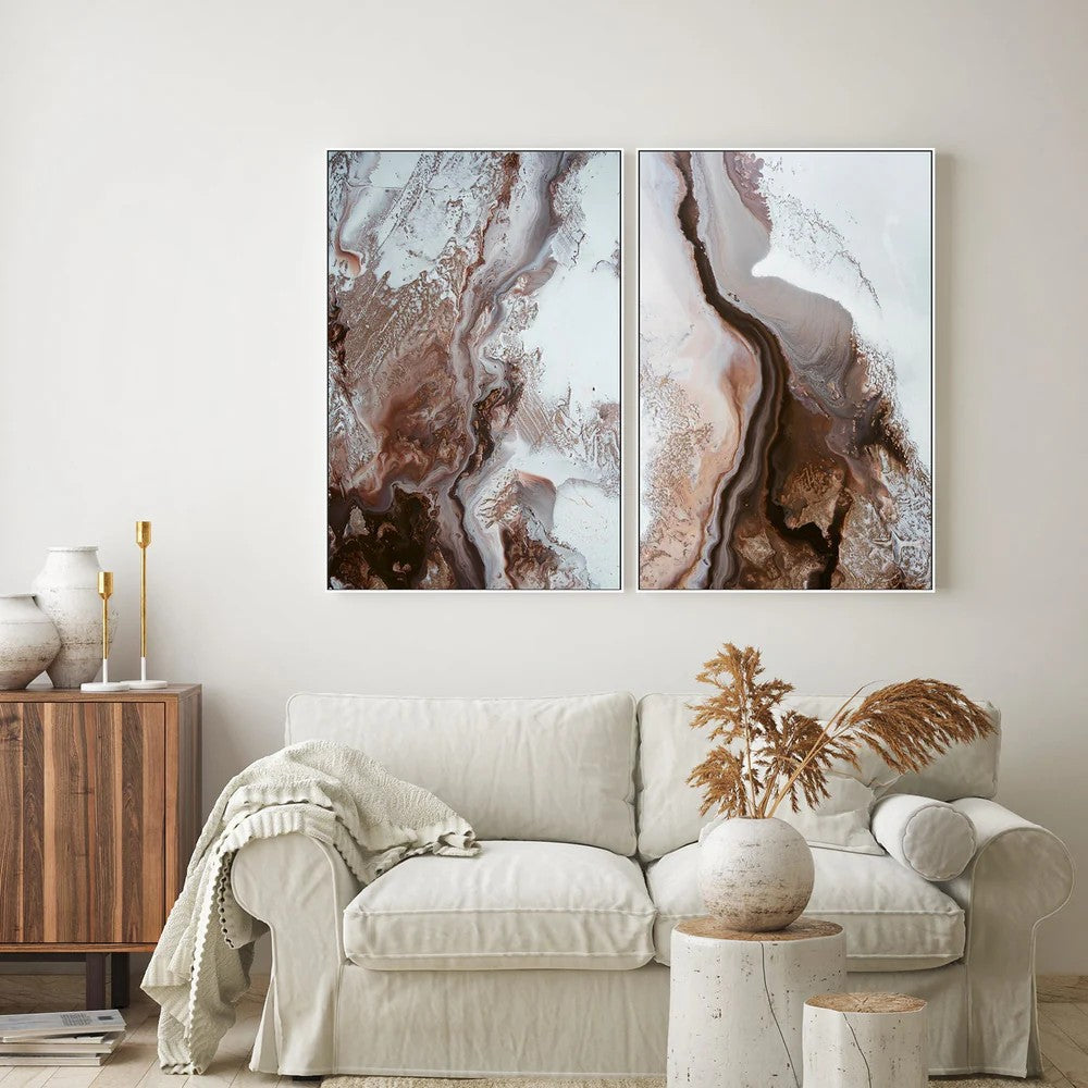 Striking abstract diptych by Petra Meikle inspired by flowing mineral forms. Rich brown, cream, and stone tones create dynamic movement. Display together for a bold, contemporary statement.