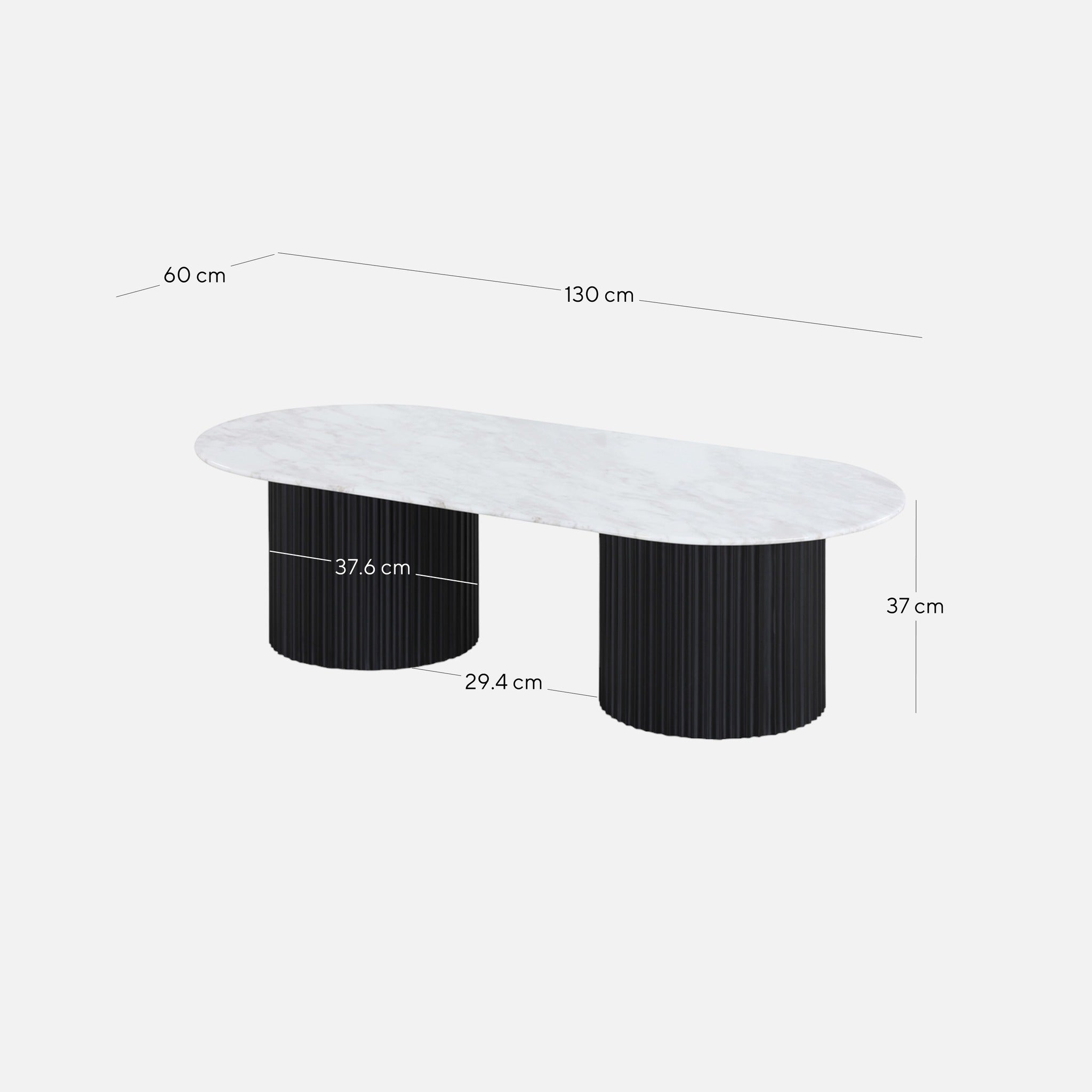Table top: 130cm (W) x 60 cm (D) Leg height: 35.5cm Base size: Diameter: 37.6cm Distance between leg: 29.4cmElino 1.3m Marble Coffee Table - Black
