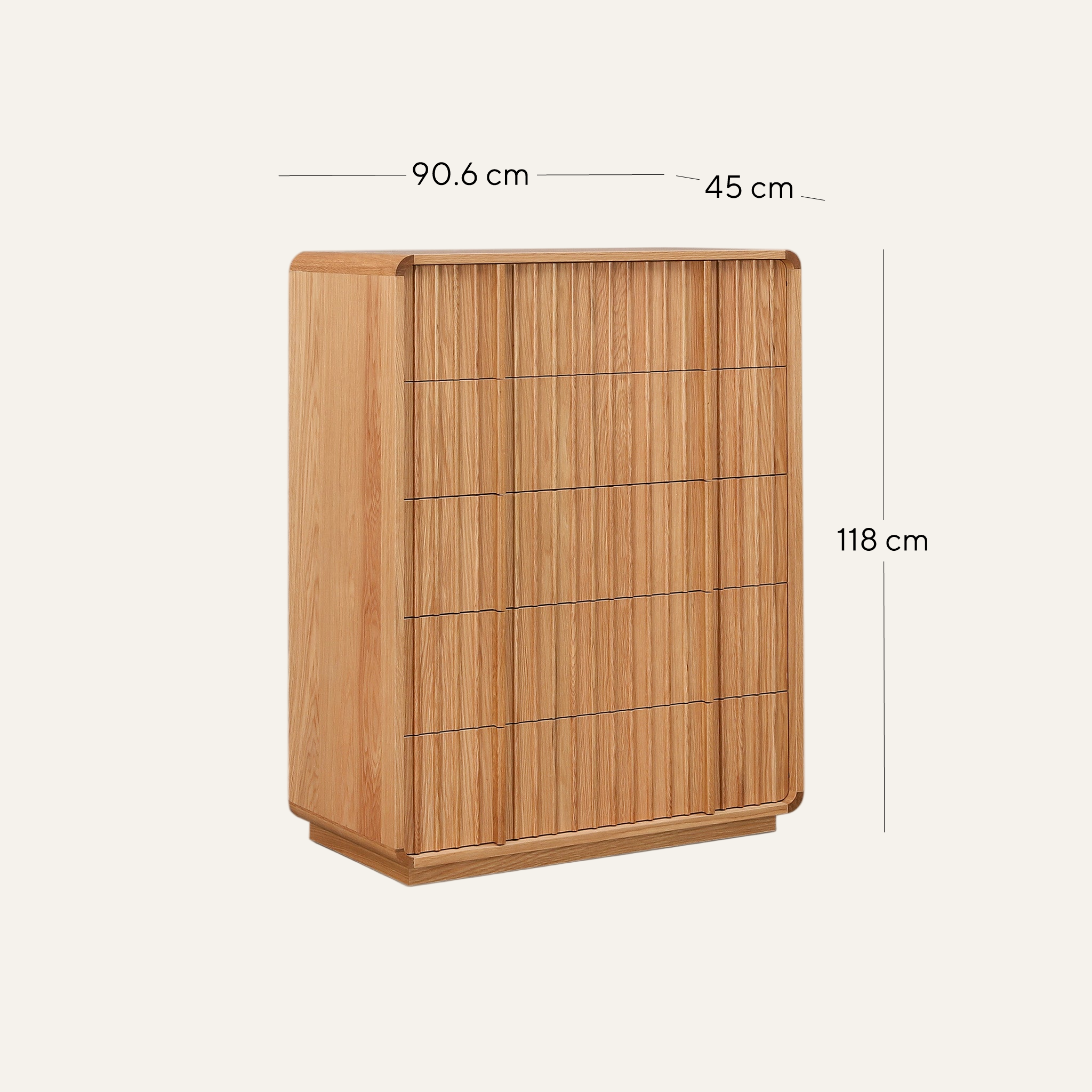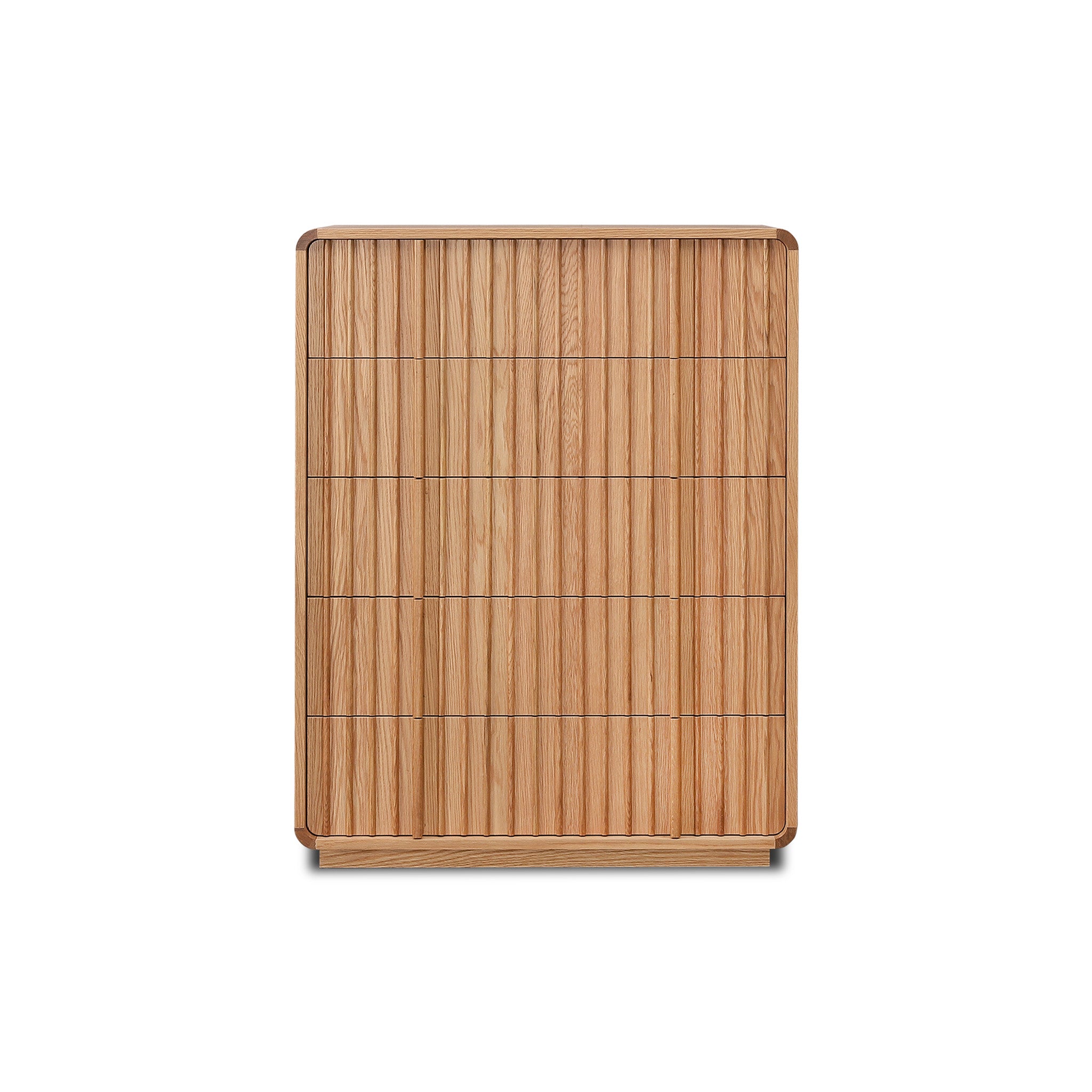 Bring natural warmth and refined texture to your bedroom with the Elviano Tallboy Drawer Chest in Natural. Its sculpted, slatted façade pairs contemporary style with the beauty of timber, creating an effortless modern statement.