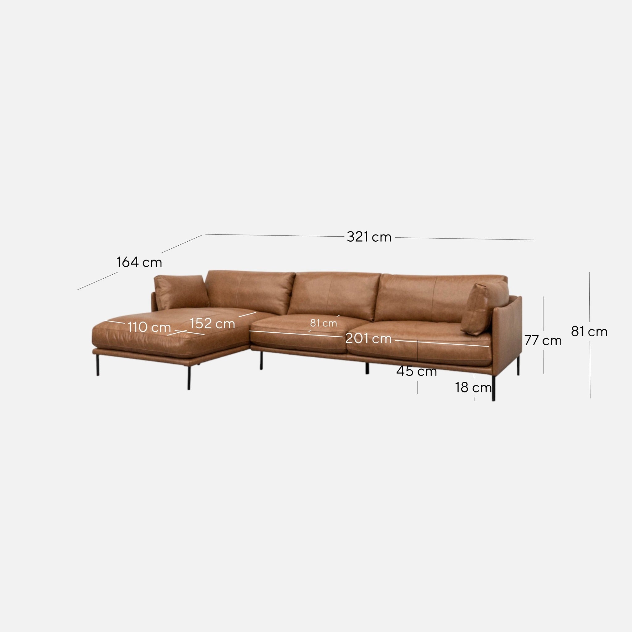 Overall: 321cm (W) x 164cm (D) x 81cm (H) Arm Height: 77cm Leg Height: 18cm Sofa Section: 206cm (W) x 93cm (D) x 81cm (H) Seat: 201cm (W) x 81cm (D) x 45cm (H) Chaise Section: 115cm (W) x 164cm (D) x 81cm (H) Seat: 110cm (W) x 152cm (D) x 45cm (H)