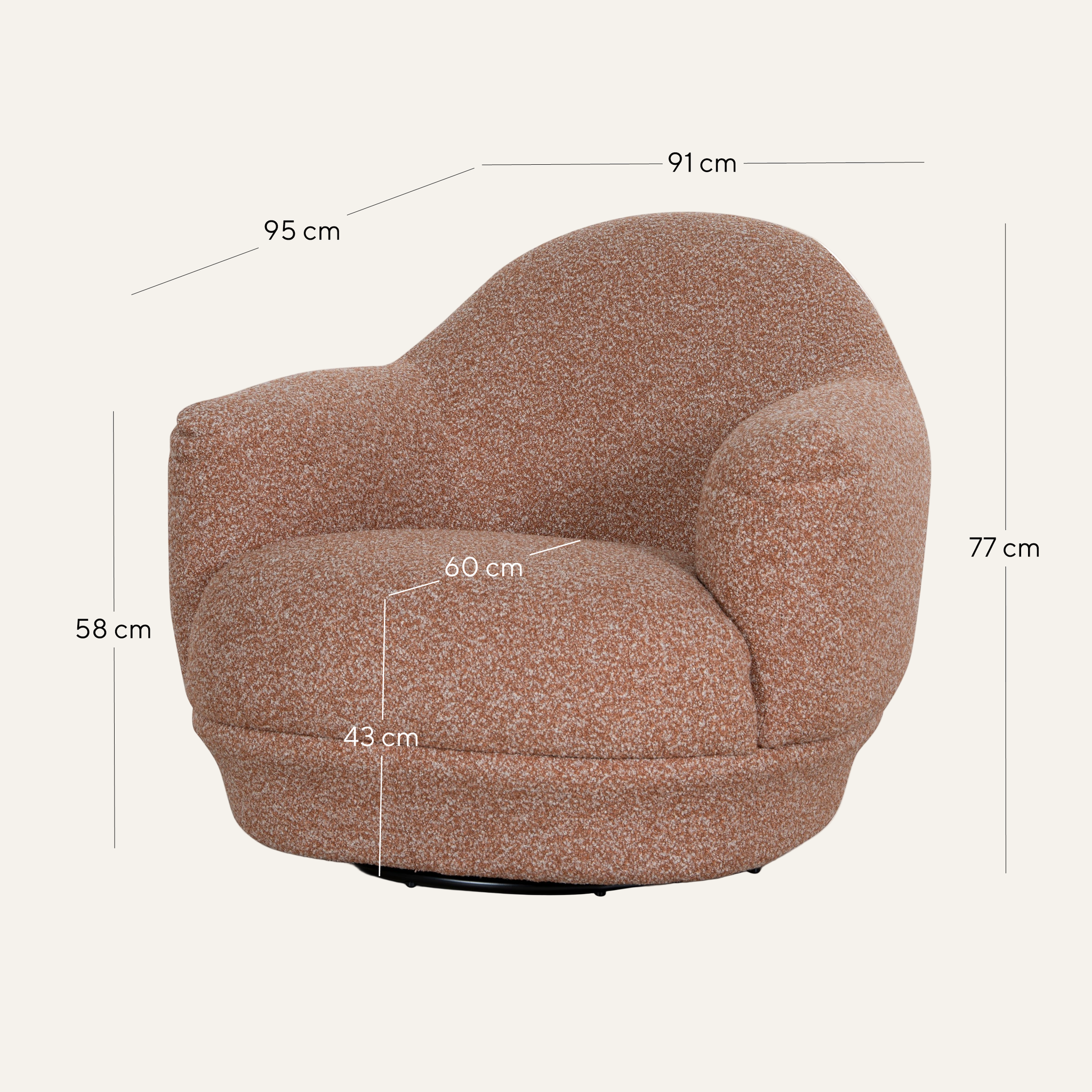 Overall: 91cm (W) x 95cm (D) x 77cm (H) Seat: 58cm (W) x 60cm (D) x 43cm (H) Arm Height: 58/77cm Leg Height: 6cm