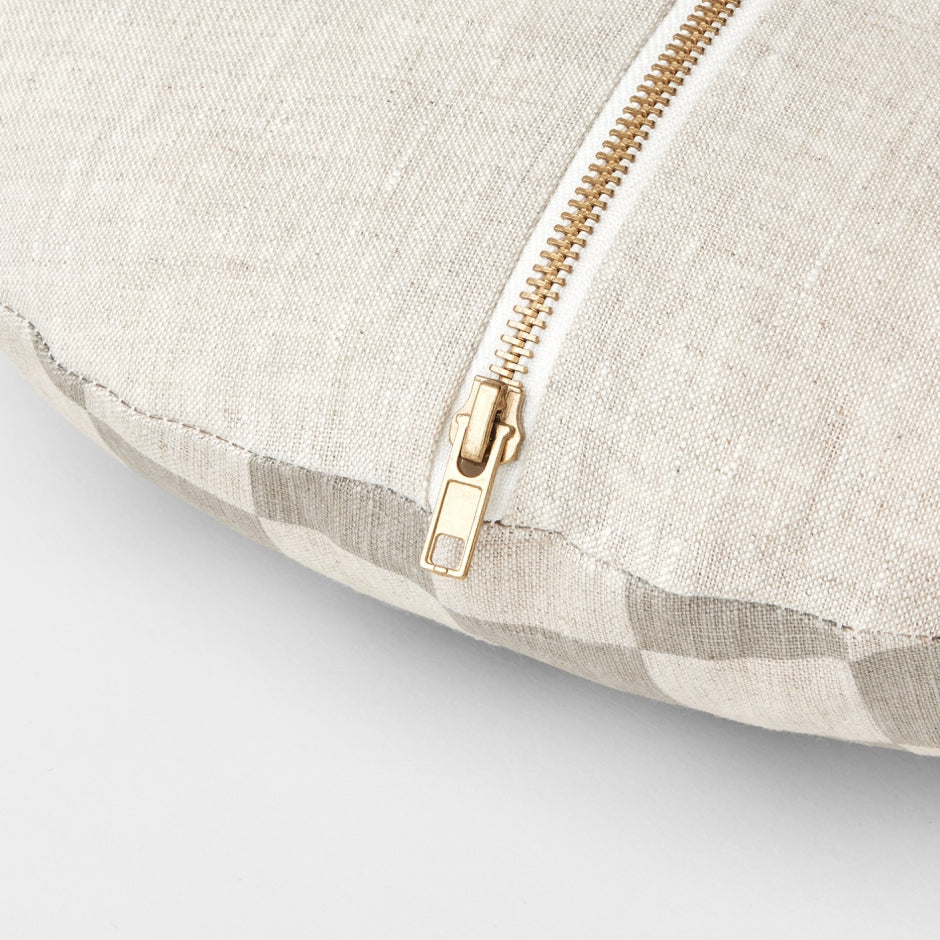 Geometric linen check in mild mist tones meets feather-filled comfort. This 40cm round cushion features a brass zip and works magic on sofas, beds, or chairs.