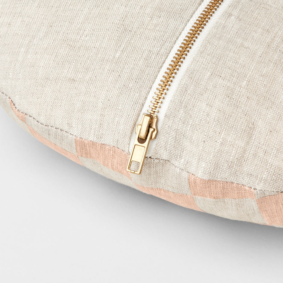 Geometric linen check in warm rose tones meets feather-filled comfort. This 40cm round cushion features a brass zip and works magic on sofas, beds, or chairs.