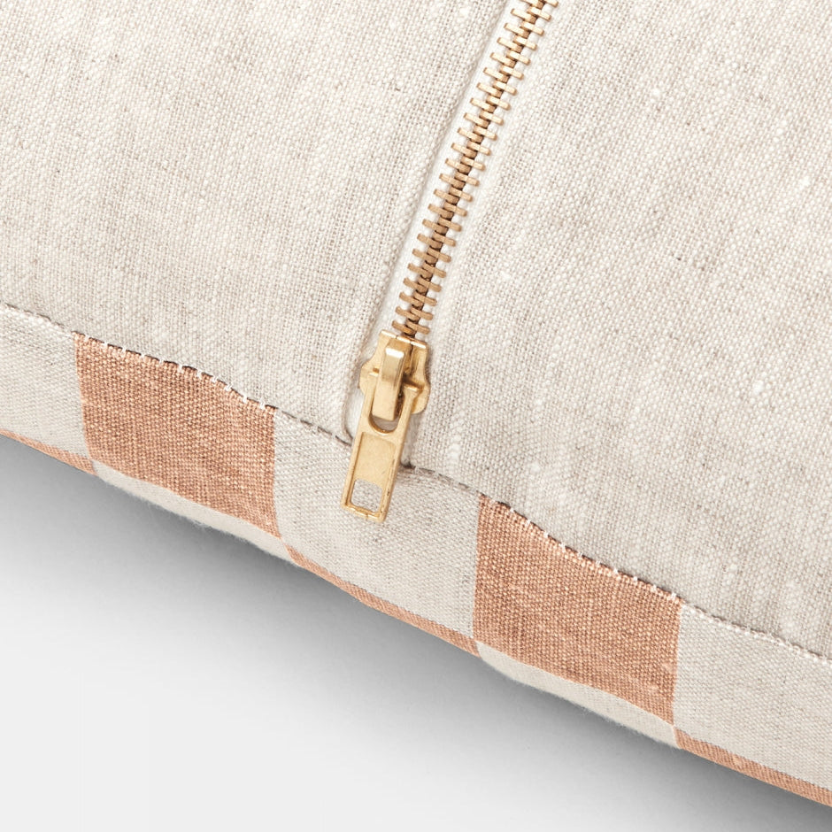 Bold peach checks meet cosy comfort in this 50cm square cushion. Feather-filled for that perfect sink-in feel, topped with a cheeky brass zip. Your sofa's new best friend.