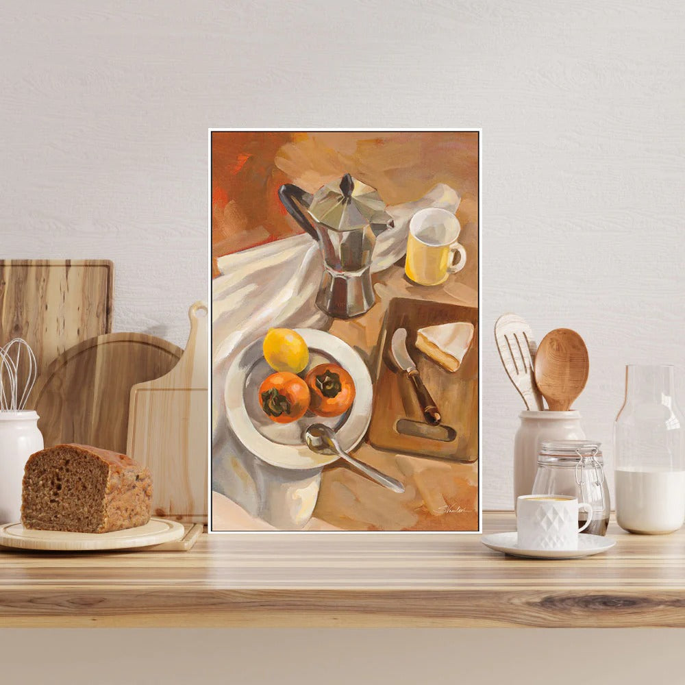 Bring a cosy, sunlit kitchen vibe into your home with this playful Kitchen Still Life by Silvia Vassileva. Showcasing a moka pot, fresh fruit, cheese, and a bright yellow mug, all rendered in warm earthy tones and soft brushstrokes, this framed canvas in an oak frame adds a charming, rustic touch. It’s like a cheerful morning snapshot that brightens your space with a touch of homey comfort and style.