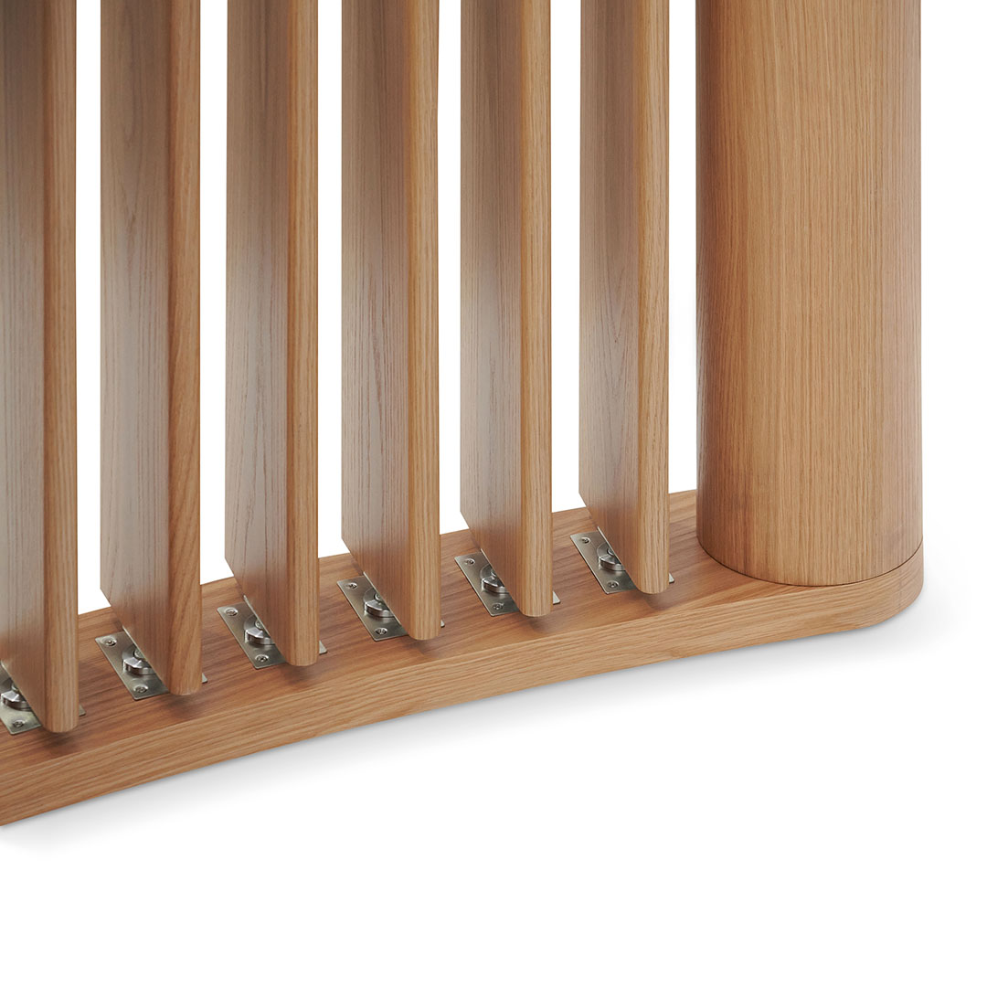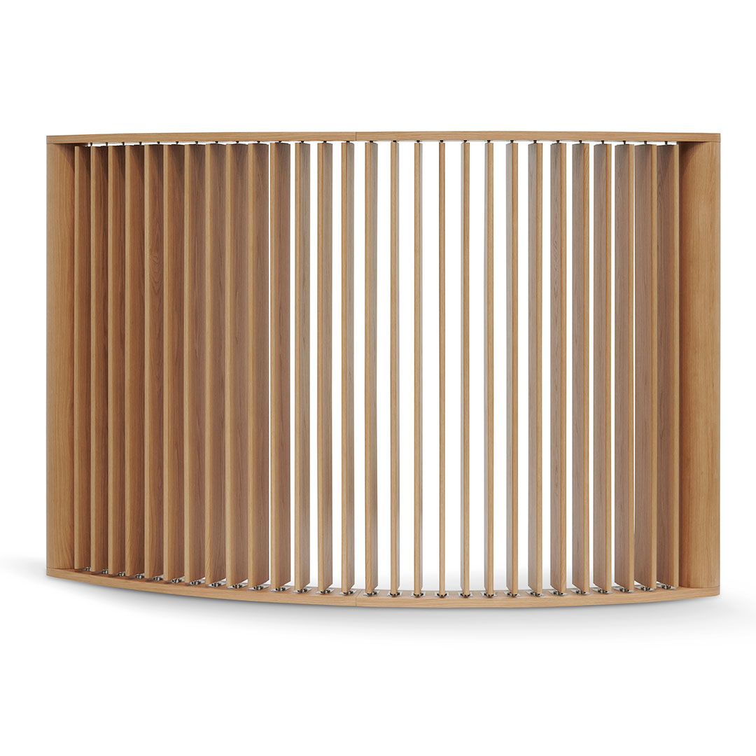 Glorify your room aesthetics with the Lawanda 3m Curved Wall Stand. Featuring the elegance of natural oak, it offers a unique way to display your decor and media.