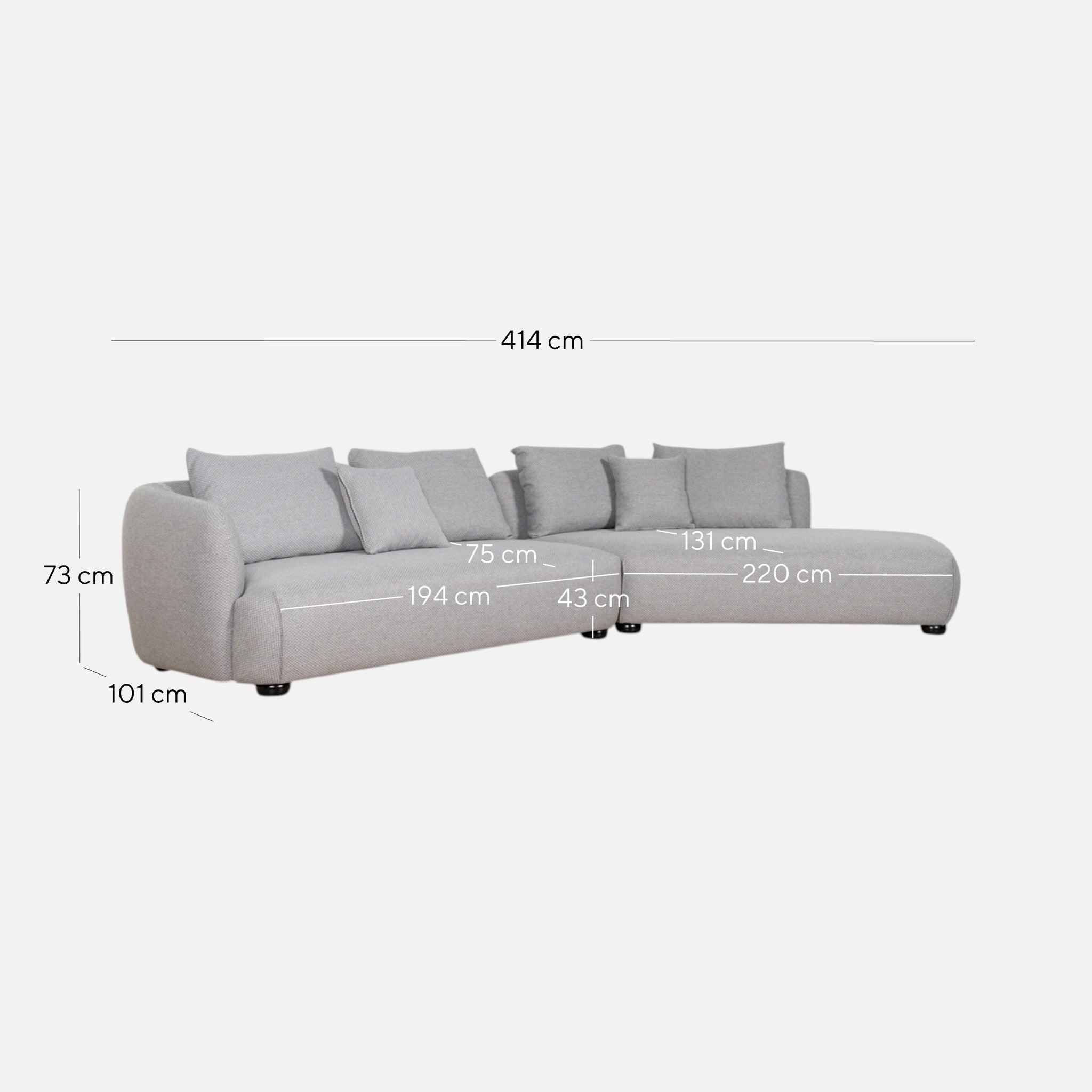 Overall: 414cm (W) x 101cm (D) x 73cm (H) Sofa Section: 356cm (W) x 131cm (D) x 43cm (H) Seat: 194cm (W) x 75cm (D) x 43cm (H) Chaise: 220cm (W) x 131cm (D) x 43cm (H) Leg Height: 5cm