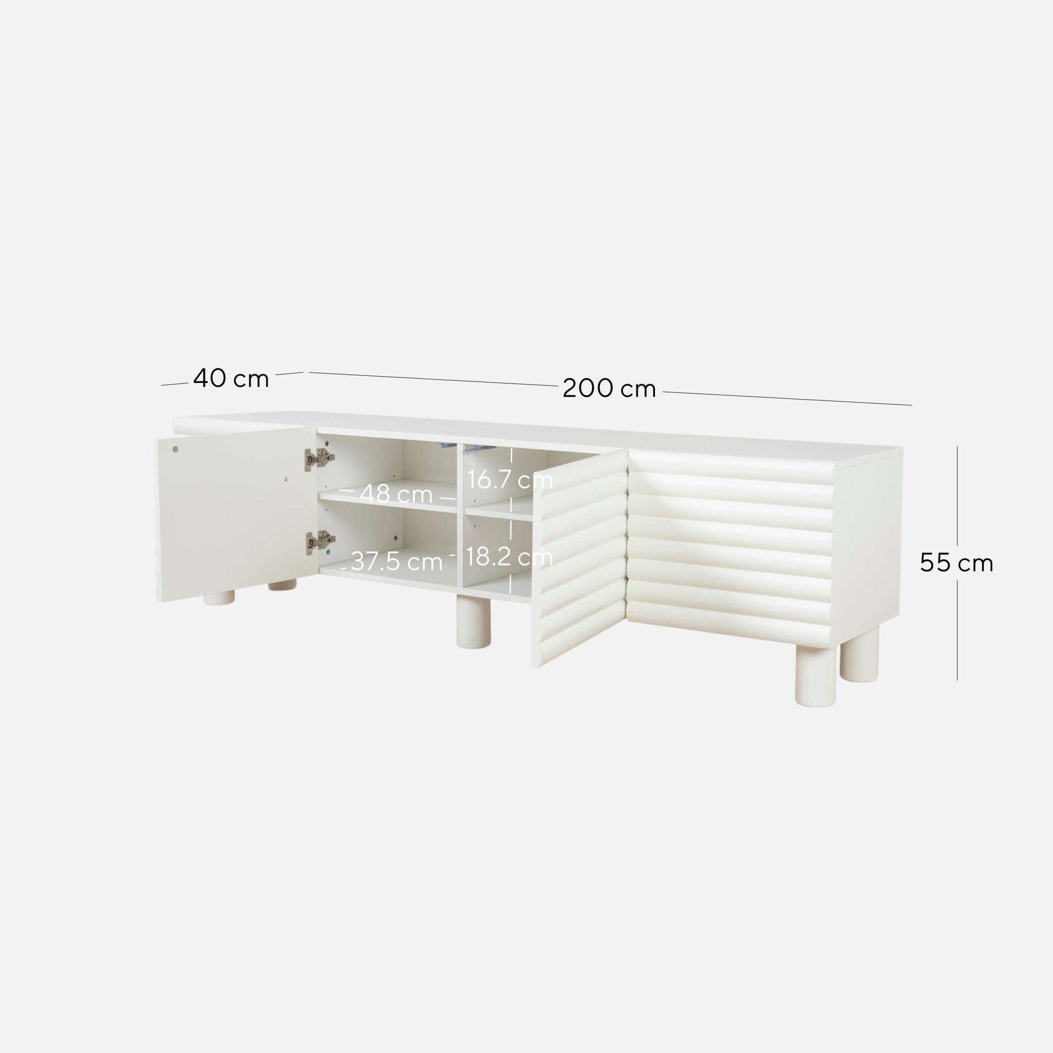 Overall: 200cm (W) x 40cm (D) x 55cm (H) Internal shelf (Left and Right top): 47cm (W) x 37.5cm (D) x 16.7cm (H) Internal shelf (Left and Right bottom): 47cm (W) x 37.5cm (D) x 18.2cm (H) Internal shelf (Middle top): 48cm (W) x 37.5cm (D) x 16.7cm (H) Internal shelf (Middle bottom): 48cm (W) x 37.5cm (D) x 18.2cm (H)