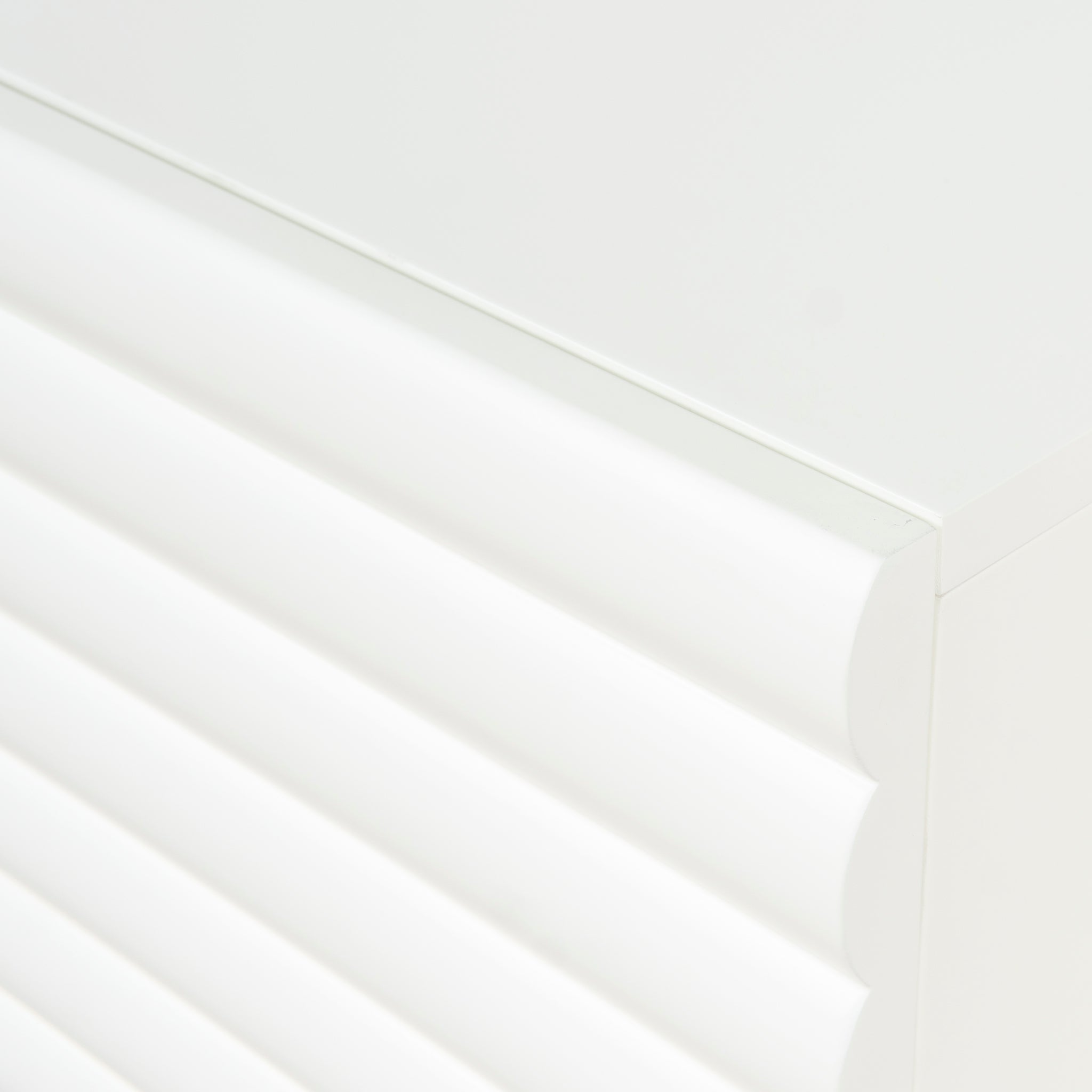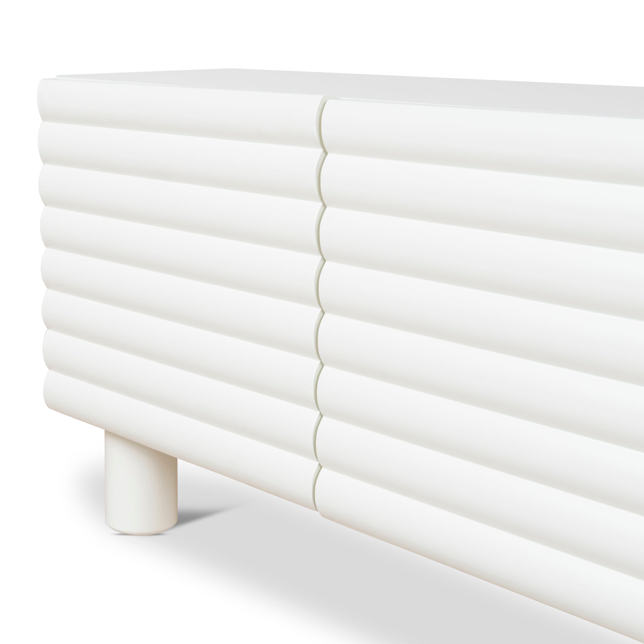 The Vasuda 2m TV Entertainment Unit, with its pristine white finish, combines elegance and practicality. Its spacious design offers ample storage for media essentials, while the sleek surface effortlessly supports your television and decor for a clutter-free, stylish setup.