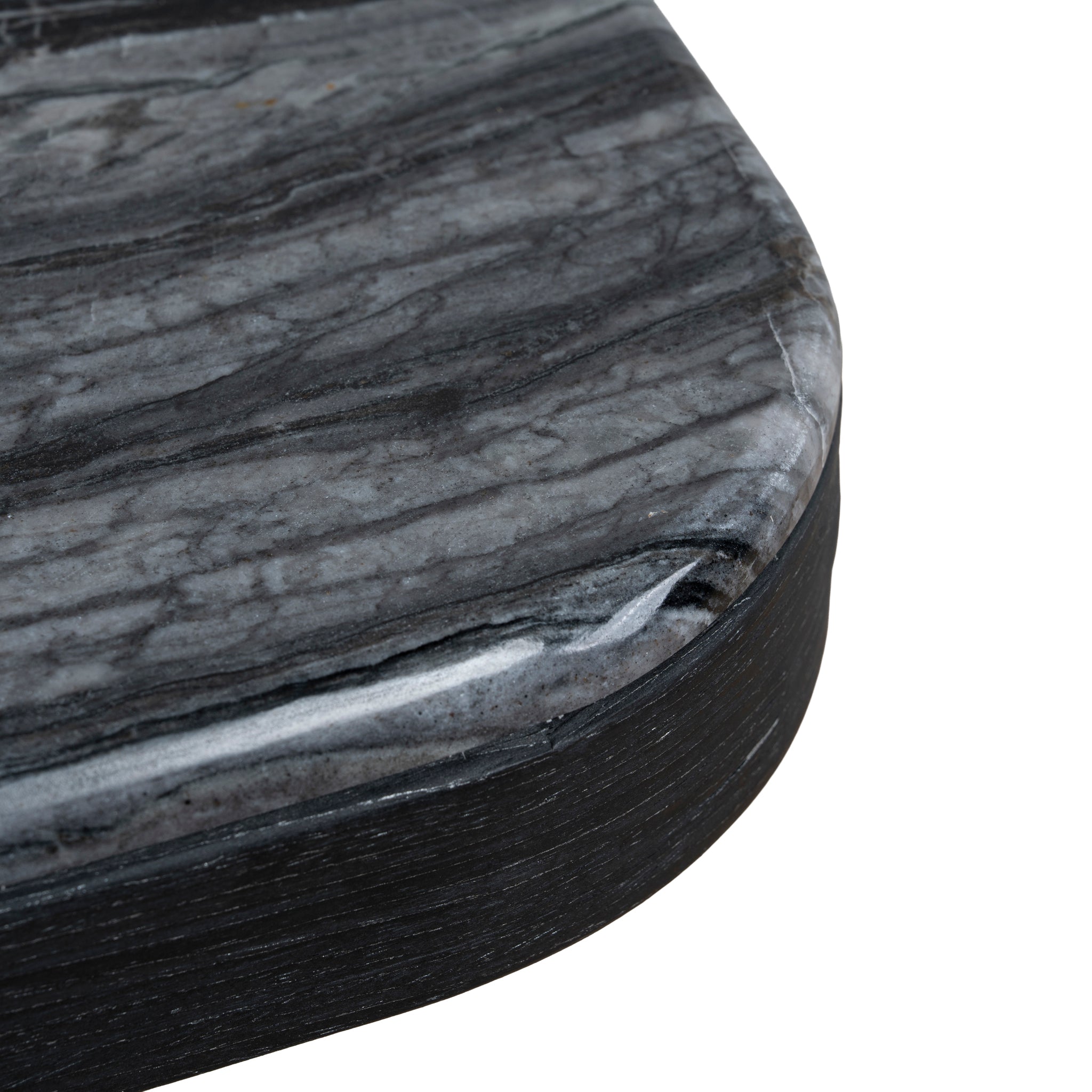 - Gently curved tabletop shape softens the heavy materials