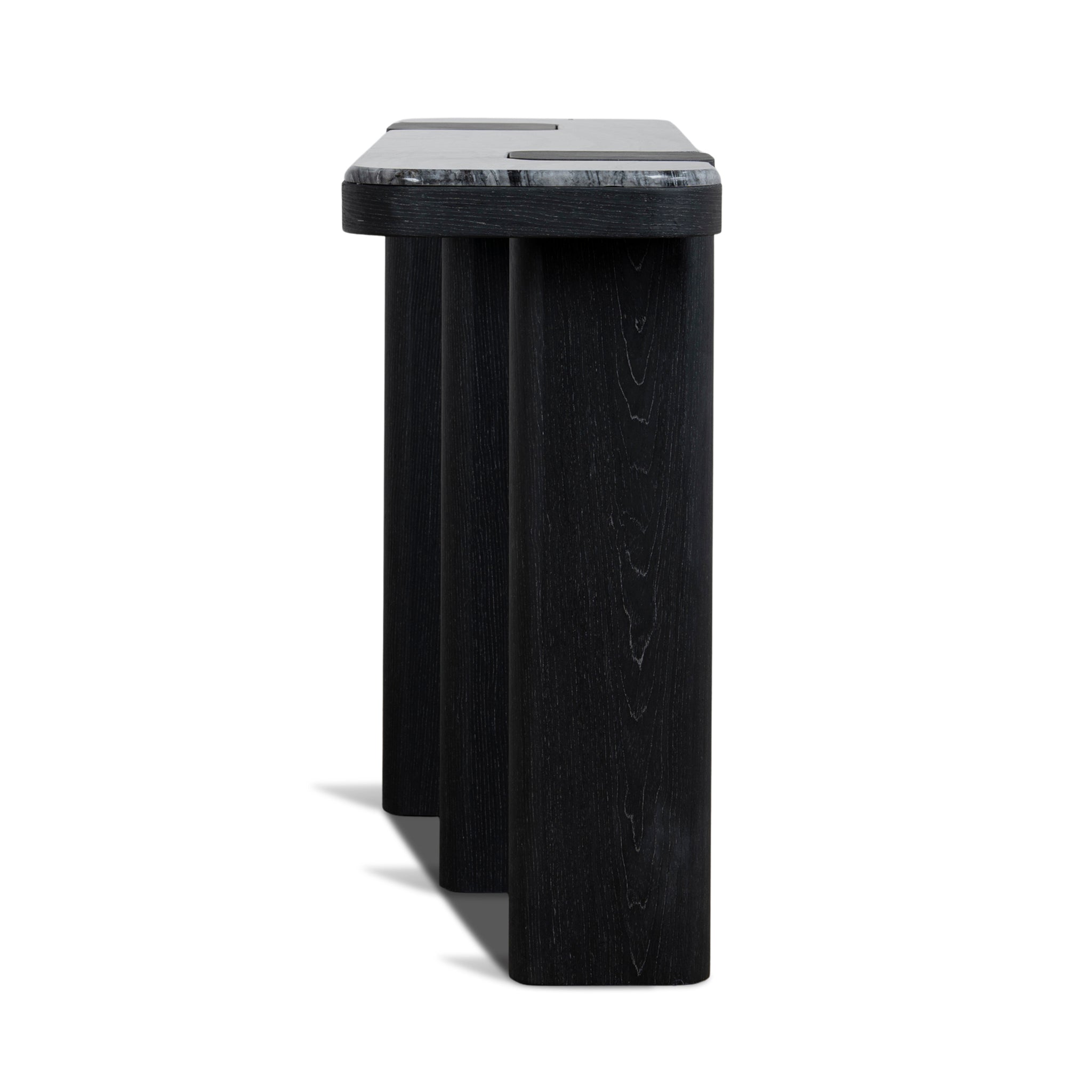 The Velanova 1.5m Marble Console Table in Black brings sculptural sophistication to contemporary interiors. Its bold silhouette features three pillar-style legs that provide a strong architectural presence, instantly elevating any entryway or living space.