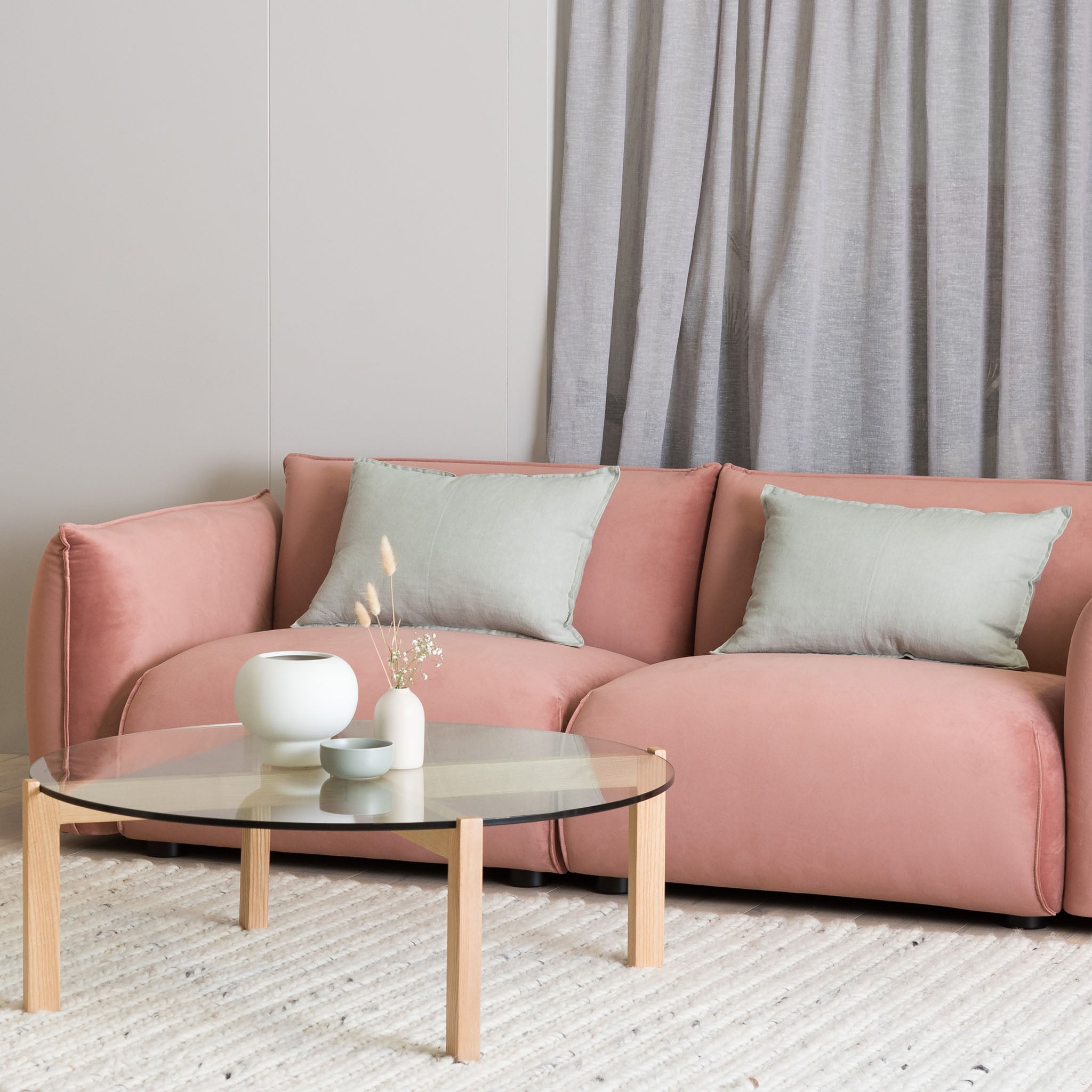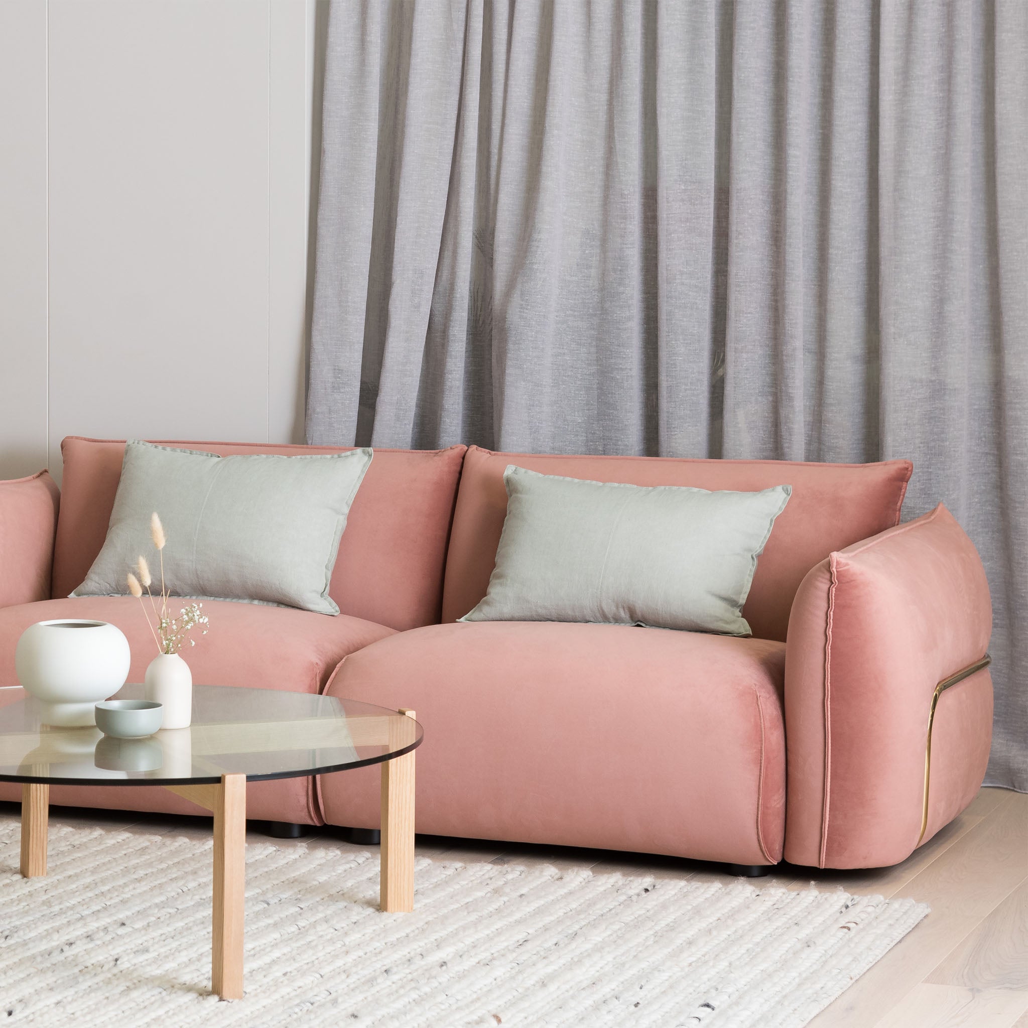 Out of stockFerrell 3 Seater Sofa - Blush Pink Velvet With Brass Frame