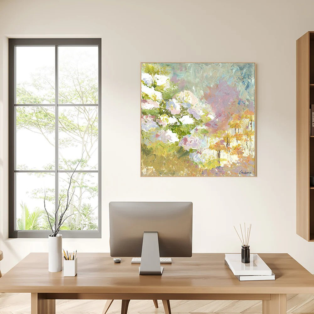 Lush impressionistic garden florals with layered brushstrokes in sage, blush, lilac and gold. Framed and ready to hang, this Karen Cavania artwork brings vibrant elegance to contemporary interiors.